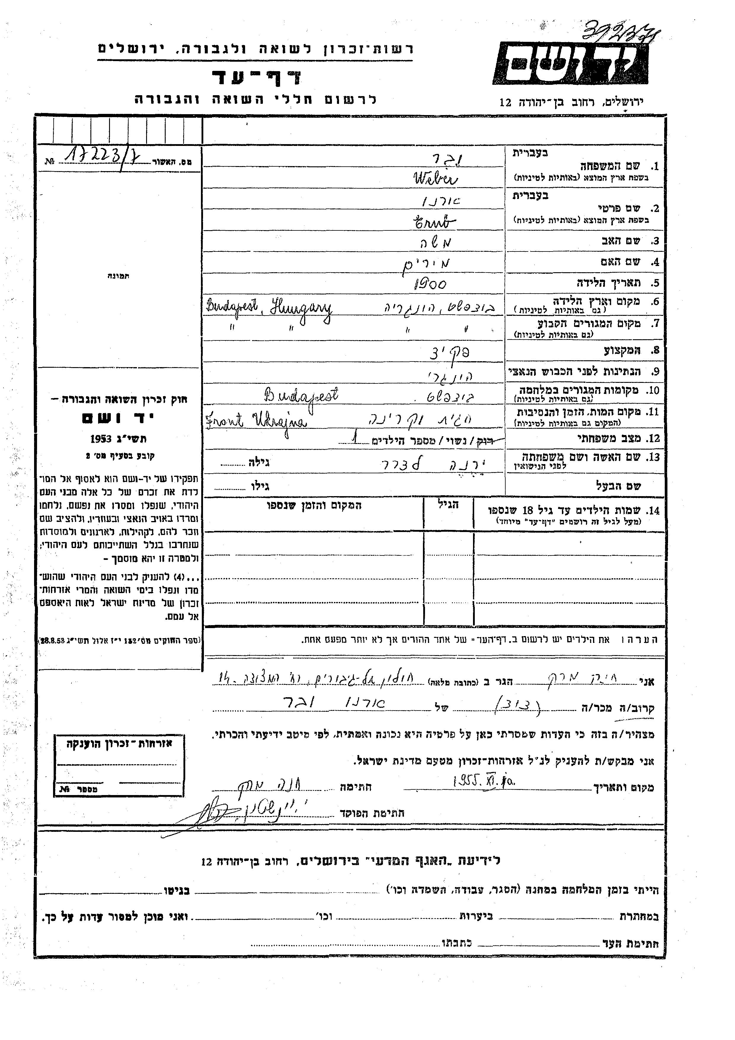 Weber Vaver Erno 1900 Budapest, Hungary Page of Testimony