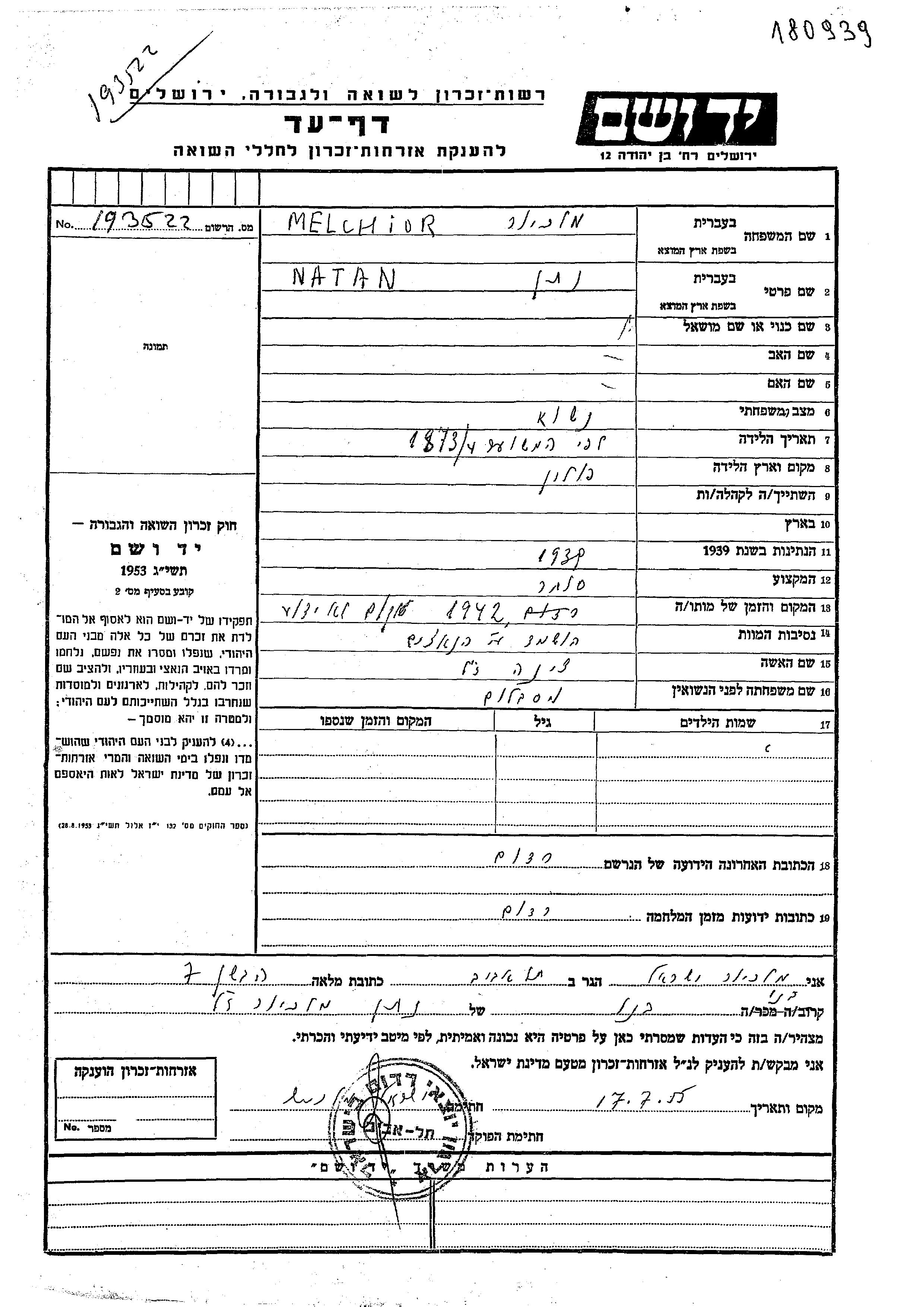 Natan Melchior was born in Poland, 1873. He was a merchant. Prior to WWII he lived in Radom, Poland. During the war he was in Radom, Poland. Natan was murdered in the Shoah. Place of death: Radom, Poland, 1942.