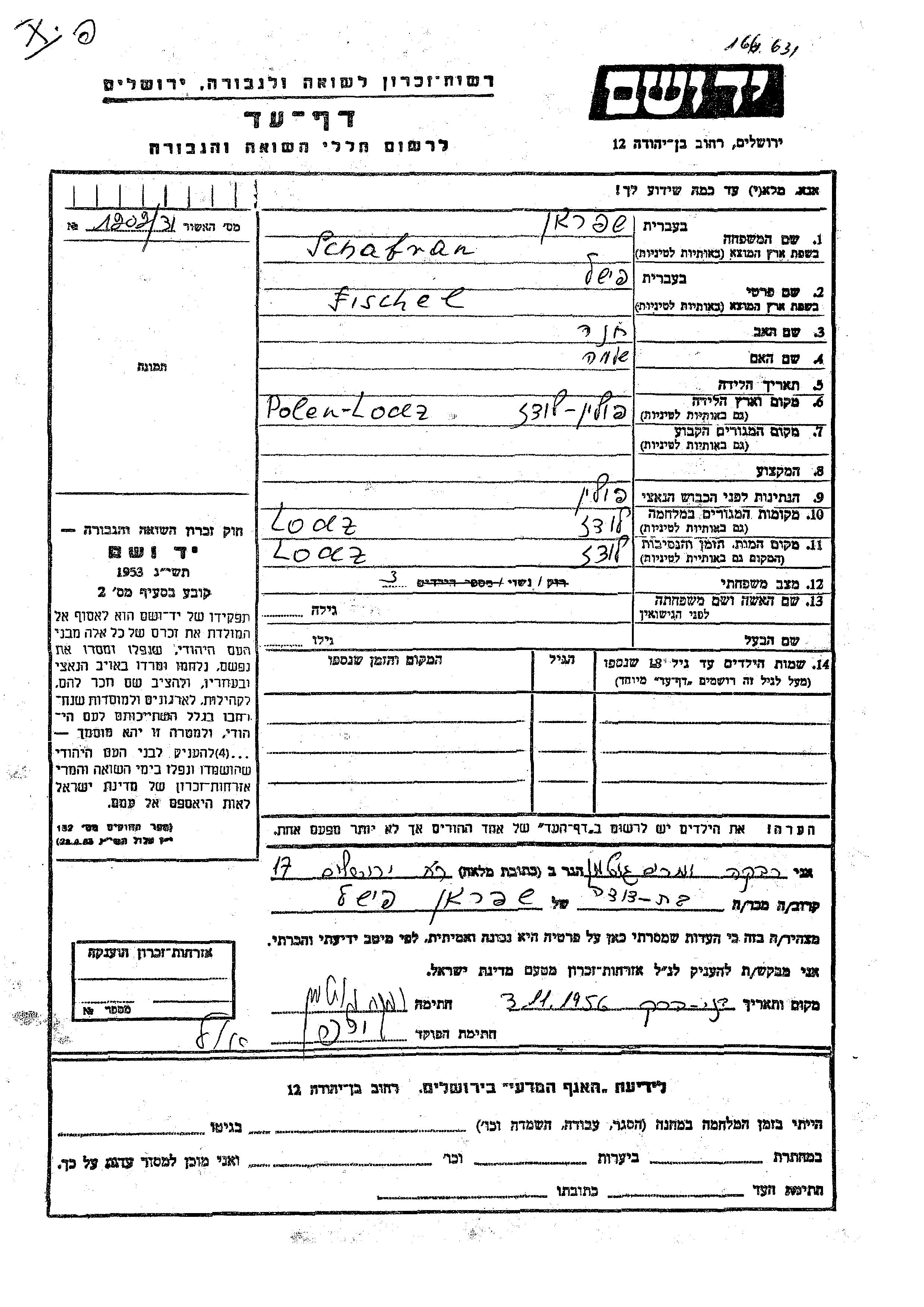 Fischel Schafran was born in Lodz, Poland to Shlomo and Khana. He was married. During the war he was in Lodz, Poland.
