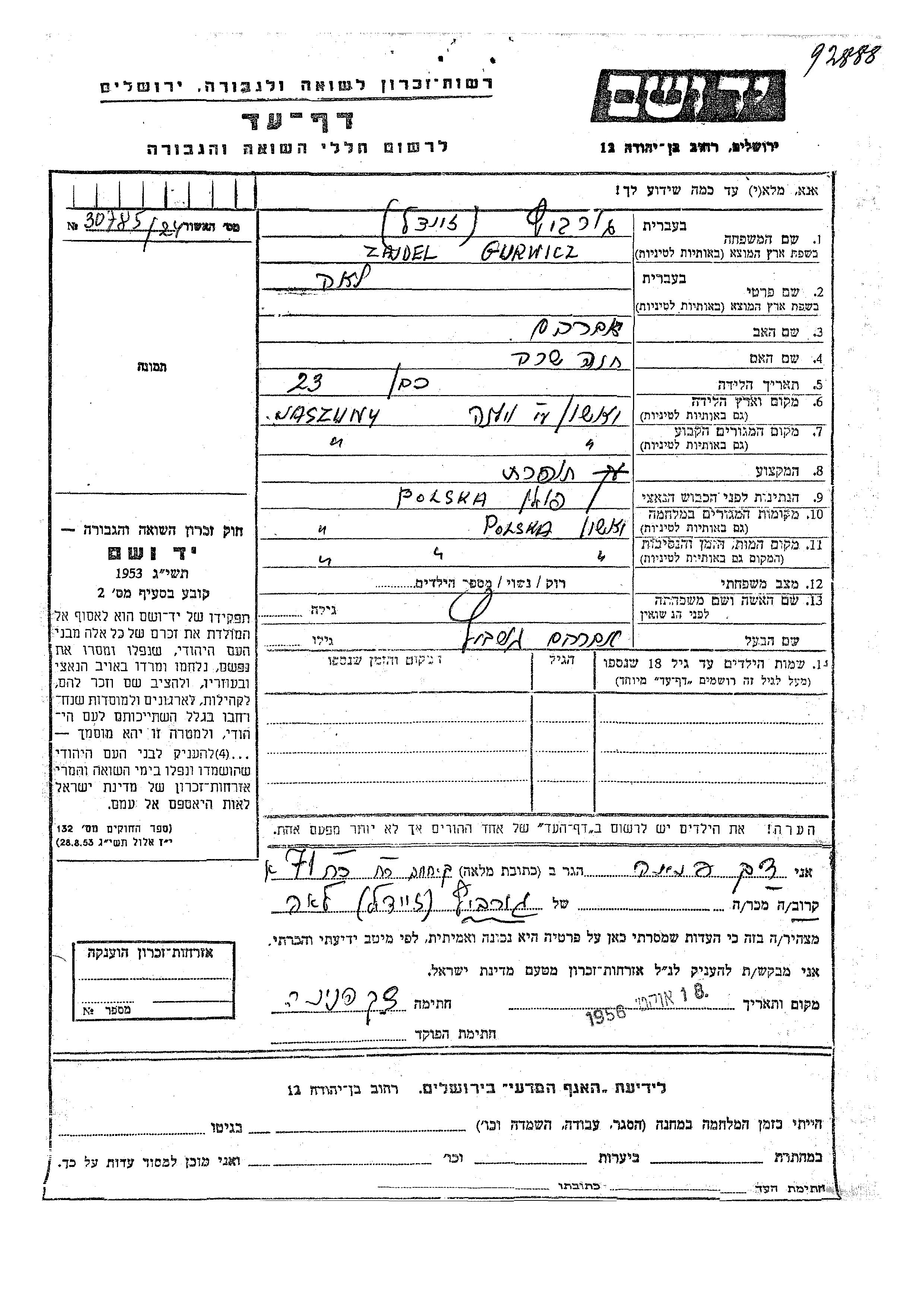 Lea Gurwicz nee Zajdel was born in Jaszuny, Poland to Avraham and Khana Sara. She was a seamstress and married to Avraham. Prior to WWII she lived in Jaszuny, Poland. During the war she was in Jaszuny, Poland. Lea was murdered in the Shoah. Place of death: Jaszuny, Poland.