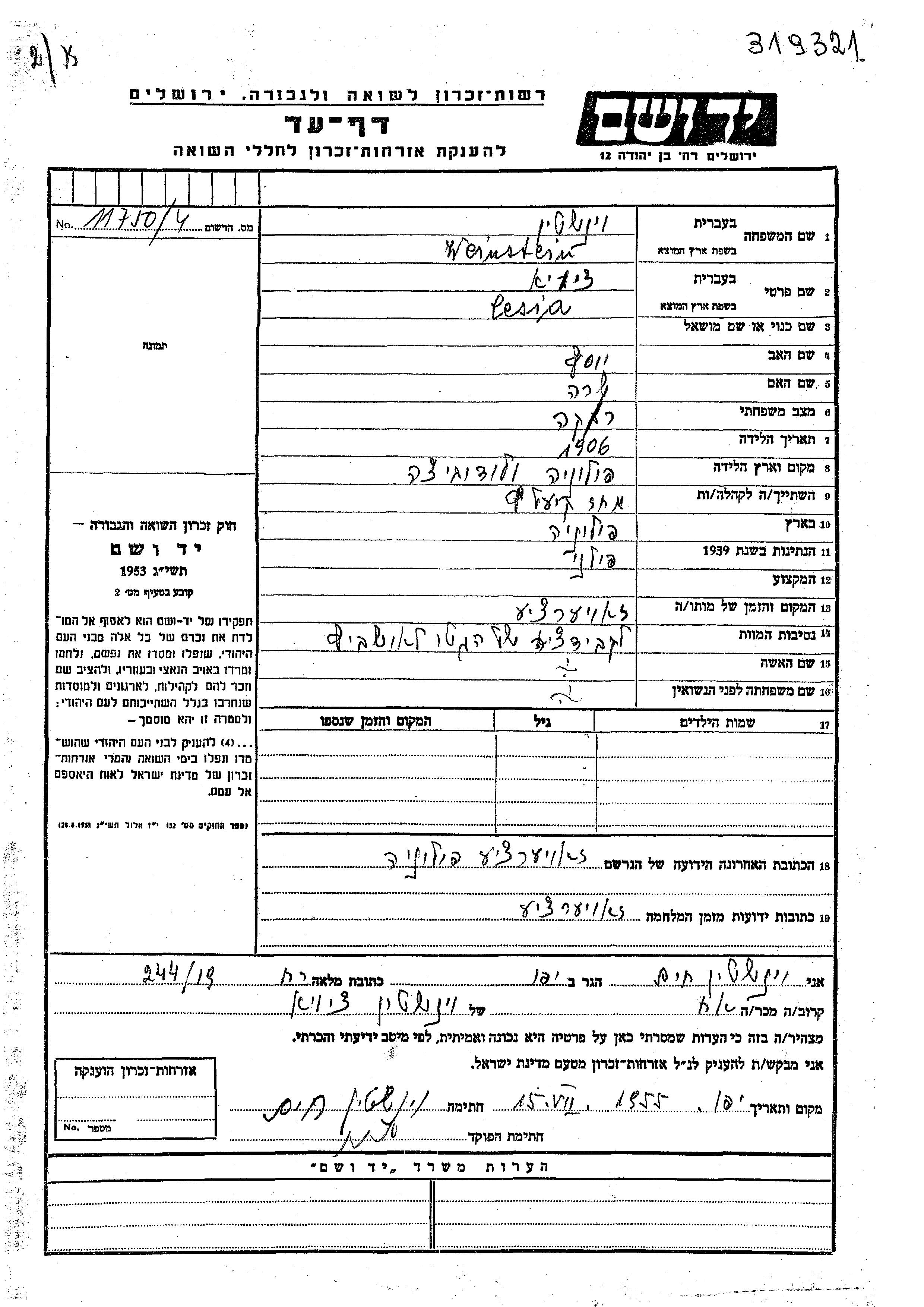 Cesia Weinstein was born in Wlodowice, Poland, 1906 to Yosef and Sara. She was single. Prior to WWII she lived in Kielce, Poland. During the war she was in Zawierce, Poland. Cesia was murdered in the Shoah. Place of death: Zawierce, Poland.