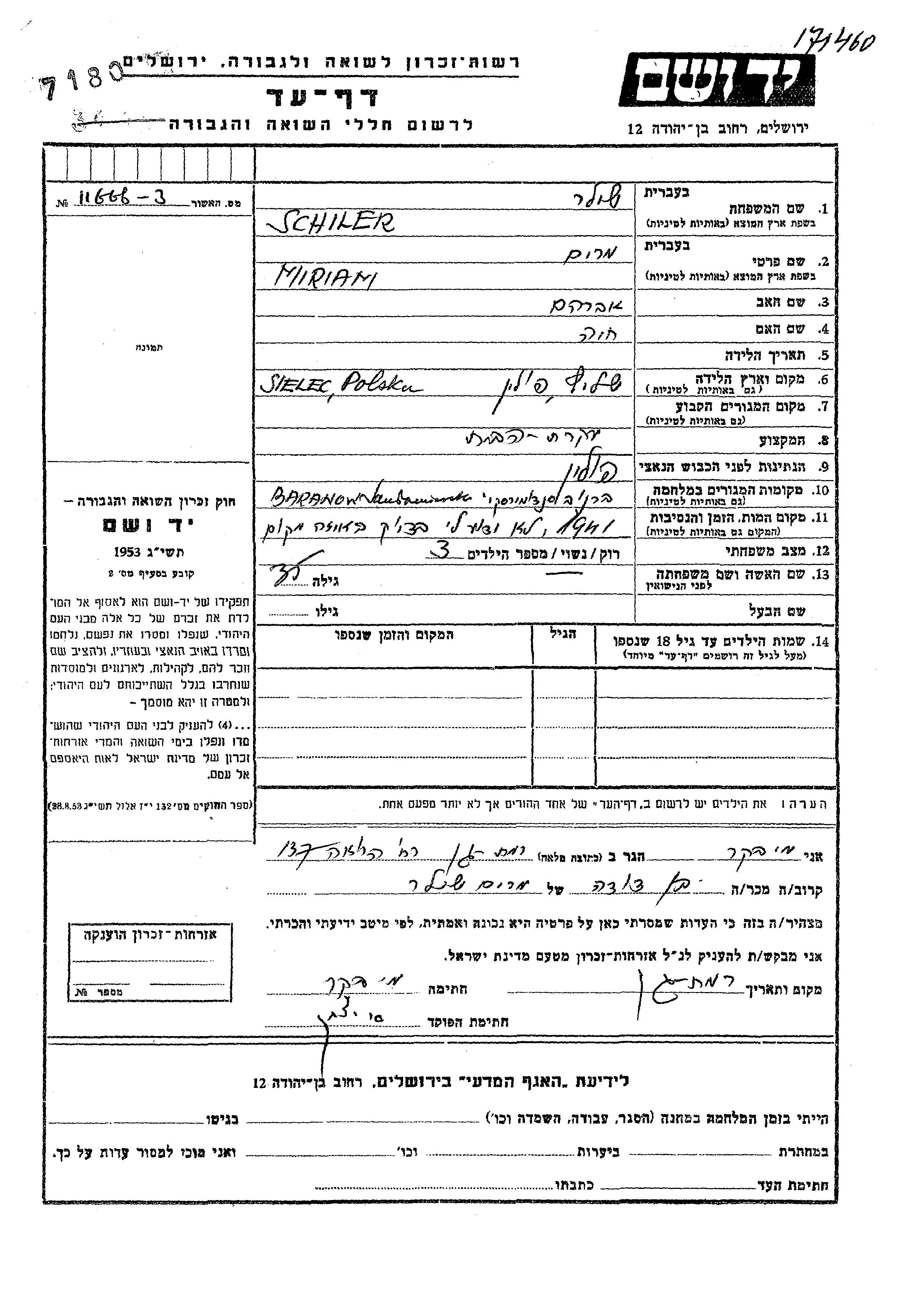 Miriam Schiler was born in Sielec, Poland to Avraham and Khaia. She was a housewife and married. During the war she was in Baranow Sandomierski, Poland. Miriam was murdered in the Shoah. Place of death: unknown, 1941.