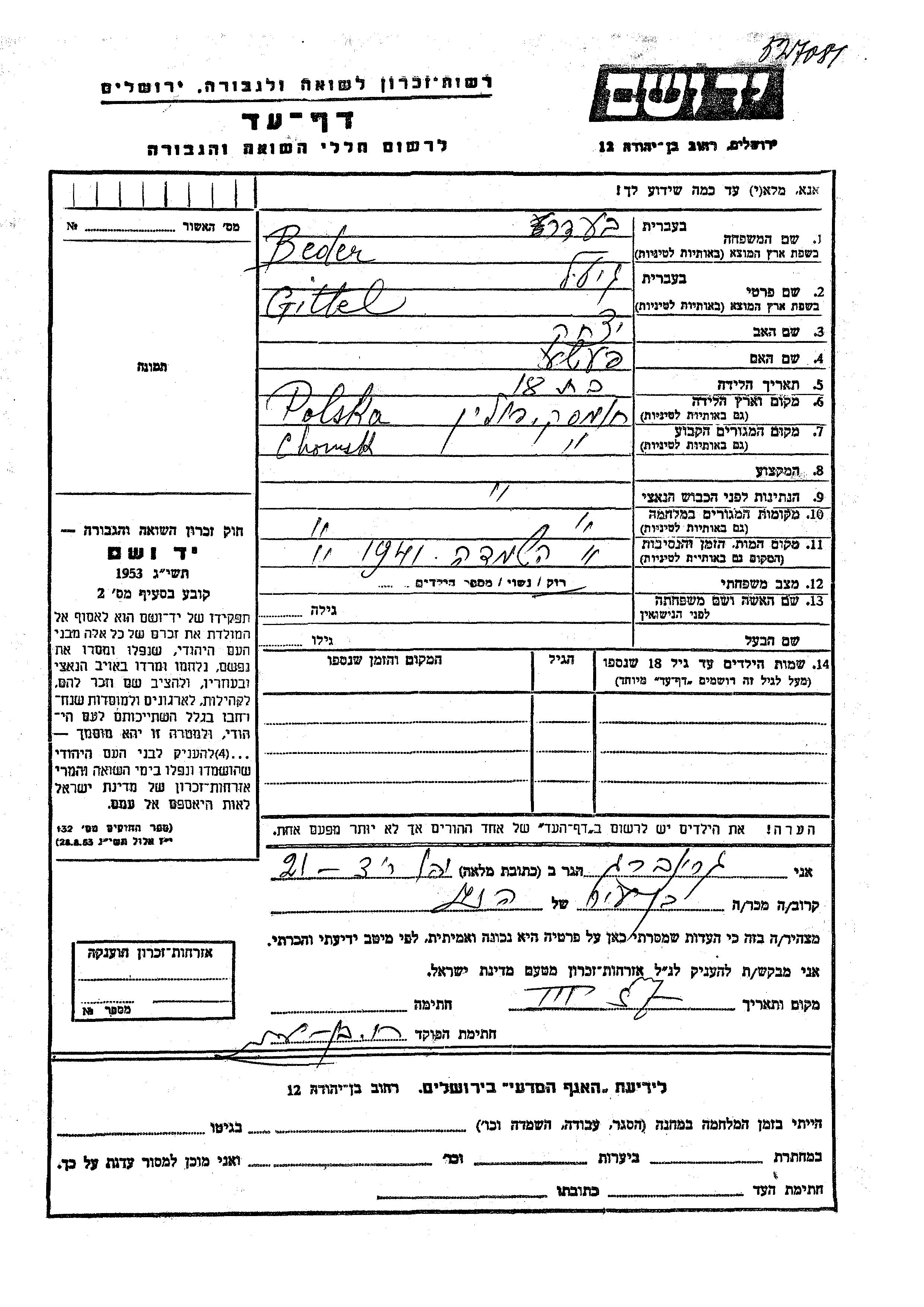 Gittel Beder Bader was born in Chomsk, Poland to Yitzkhak and Peshe. She was single. Prior to WWII she lived in Chomsk, Poland. During the war she was in Chomsk, Poland. Gittel was murdered in the Shoah. Place of death: Chomsk, Poland, 1941.