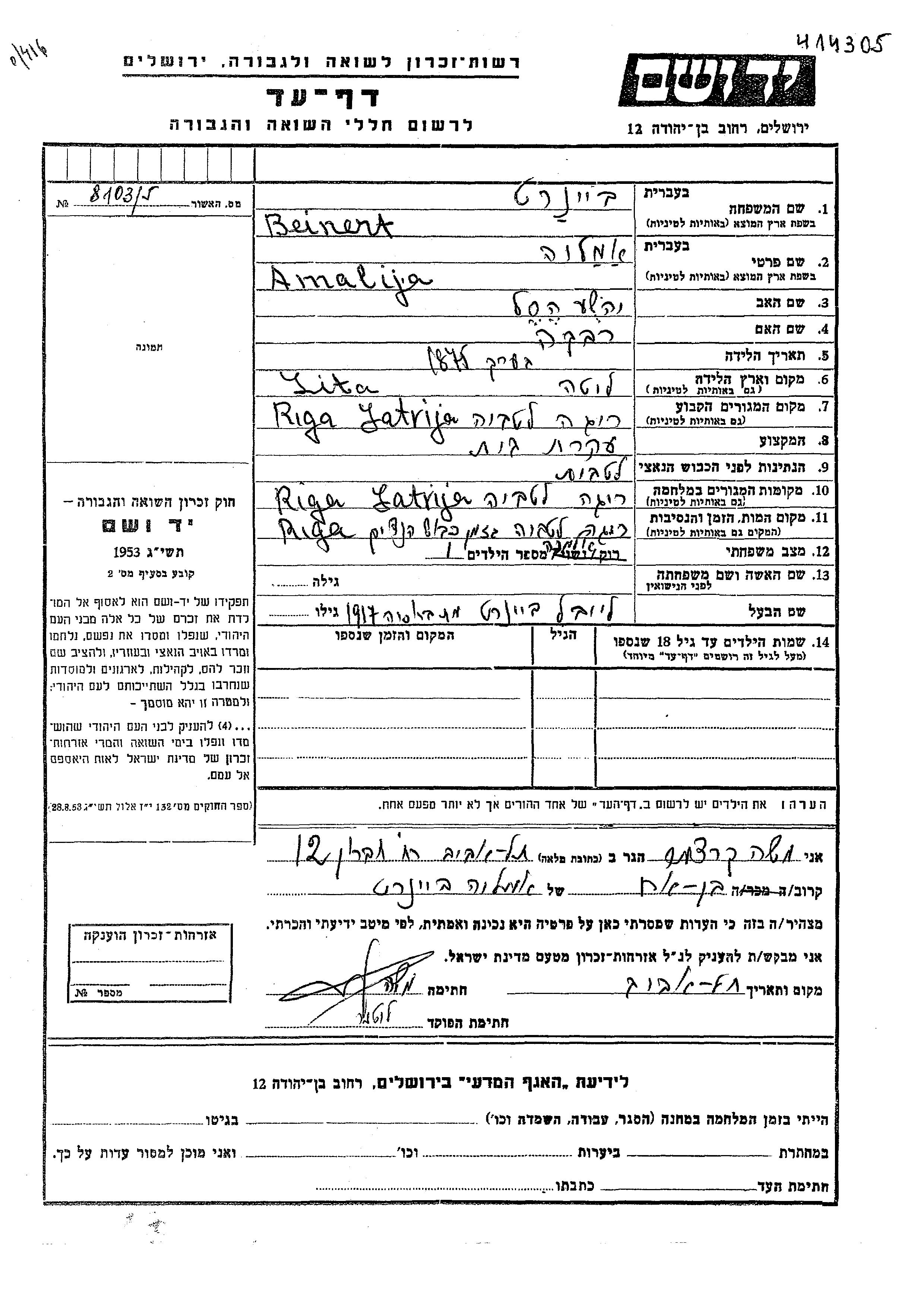 Amalya Beinert was born in Lithuania, 1875 to Yoshua Hesel and Rivka. She was a housewife and a widow of Leibel. Prior to WWII she lived in Riga, Latvia. During the war she was in Riga, Latvia. Amalya was murdered in the Shoah. Place of death: Riga, Latvia.