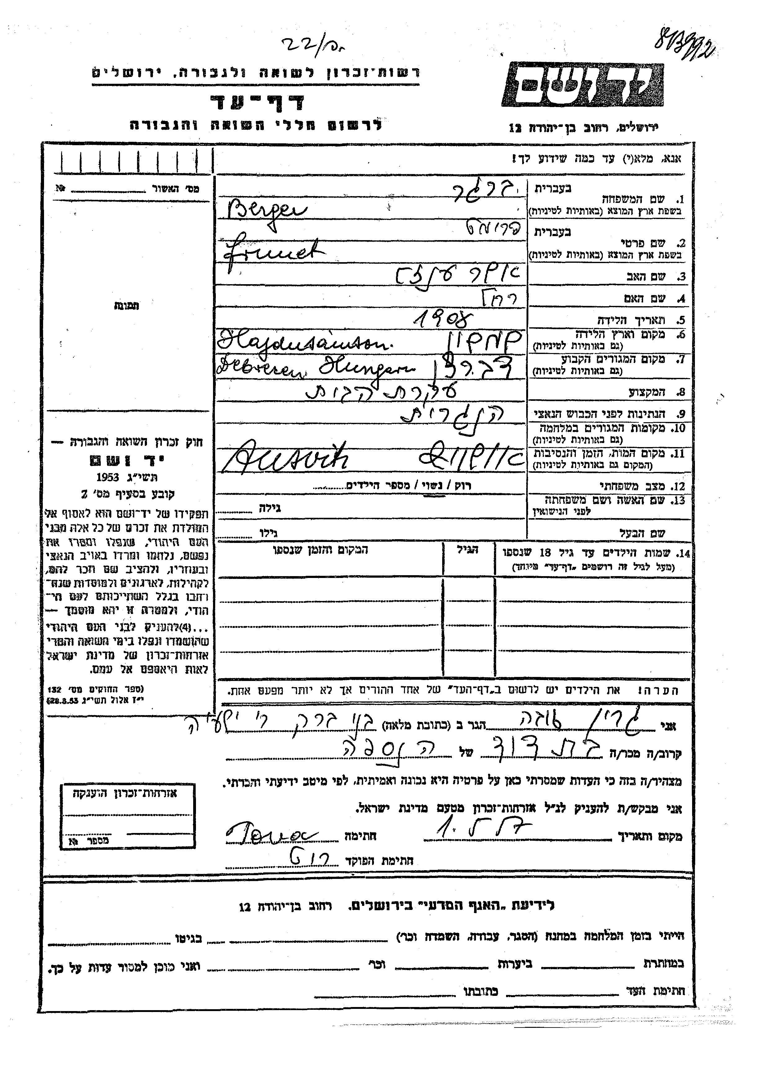 Frumet Berger was born in Hajdusamson, Hungary, 1908 to Asher Enzel and Rakhel. She was a housewife and married. Prior to WWII she lived in Debrecen, Hungary. Frumet was murdered in the Shoah. Place of death: Auschwitz, Poland.