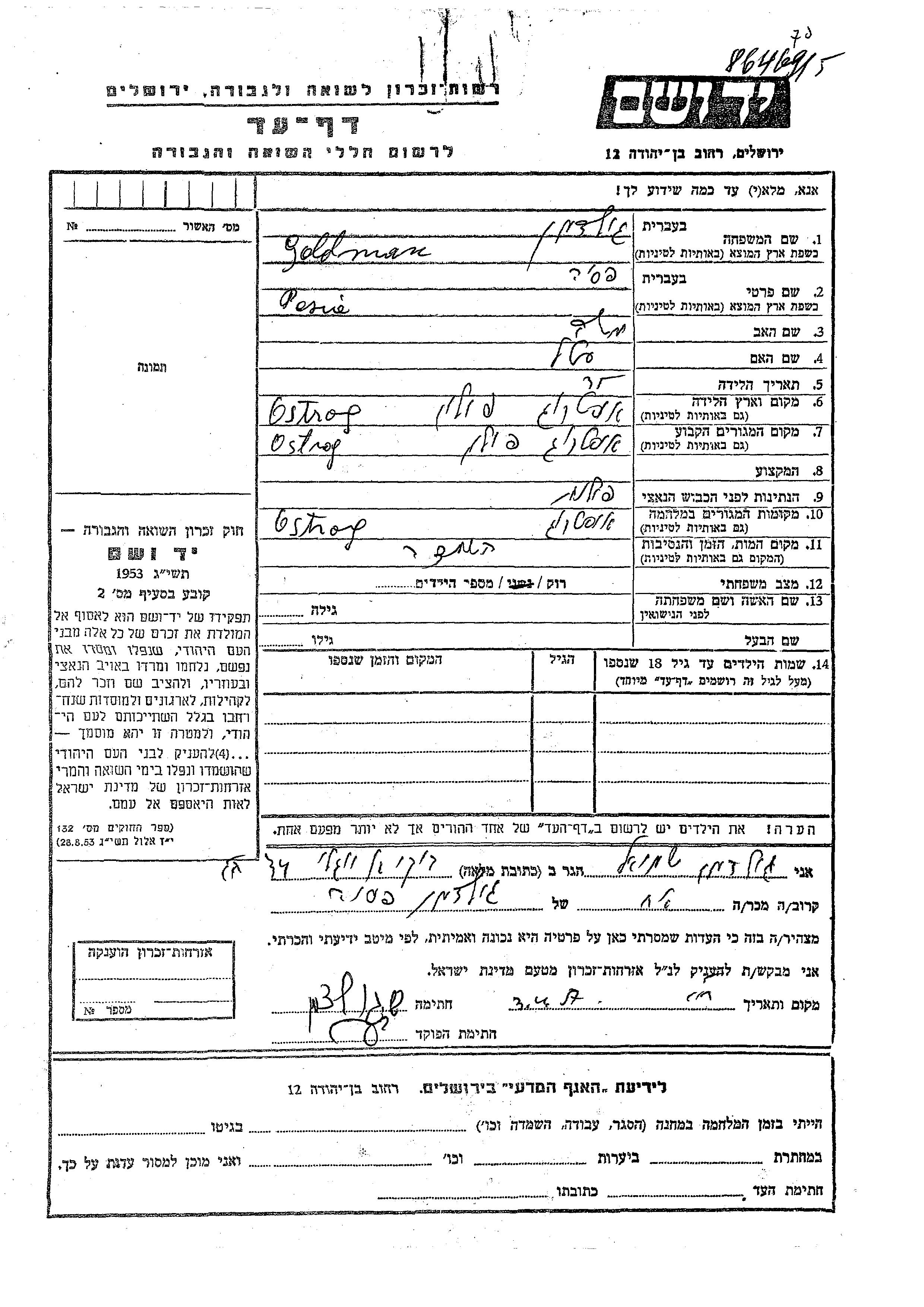 Pesia Goldman was born in Ostrog, Poland to Moshe and Etel. She was single. Prior to WWII she lived in Ostrog, Poland. During the war she was in Ostrog, Poland.