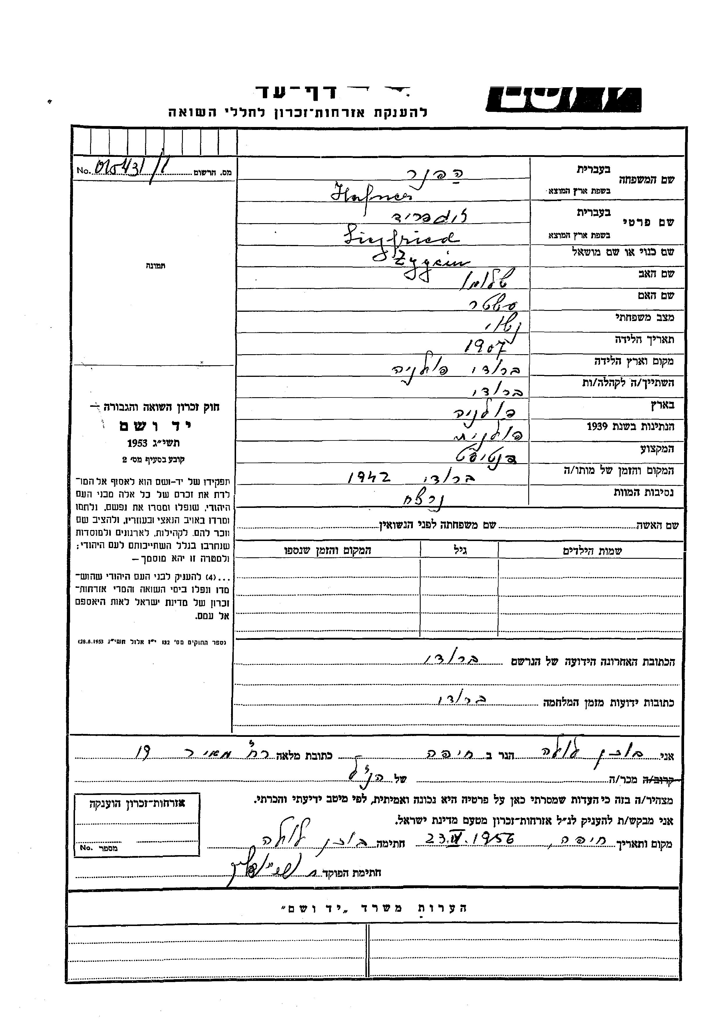 Hafner Sigfried 1907 Brody, Poland Page of Testimony