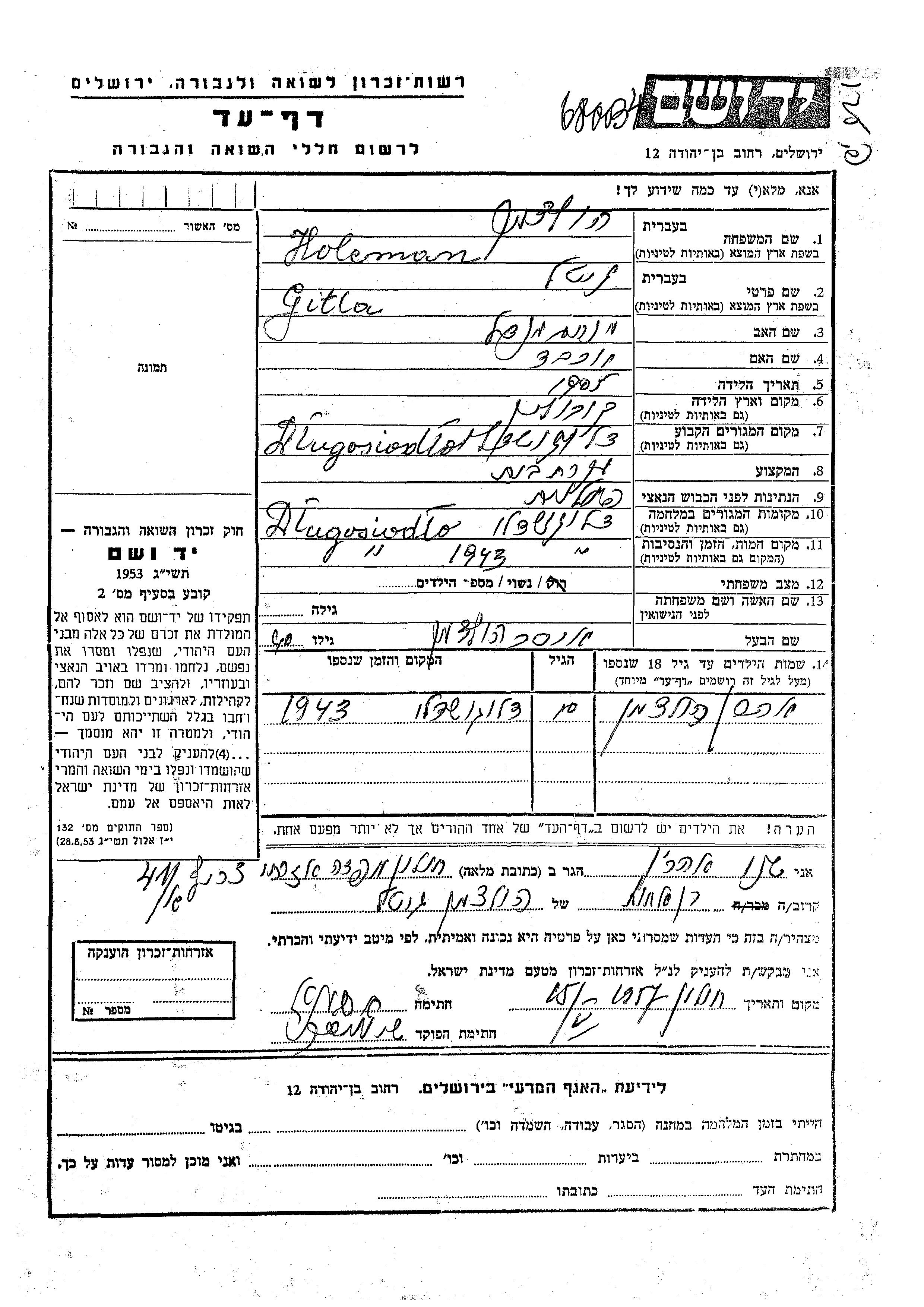 Gitla Holcman was born in Kobylin, Poland, 1905 to Menakhem Mendel and Yokheved. She was a housewife and married to Oser. Prior to WWII she lived in Dlugosiodlo, Poland. During the war she was in Dlugosiodlo, Poland. Gitla was murdered in the Shoah. Place of death: Dlugosiodlo, Poland, 1943.