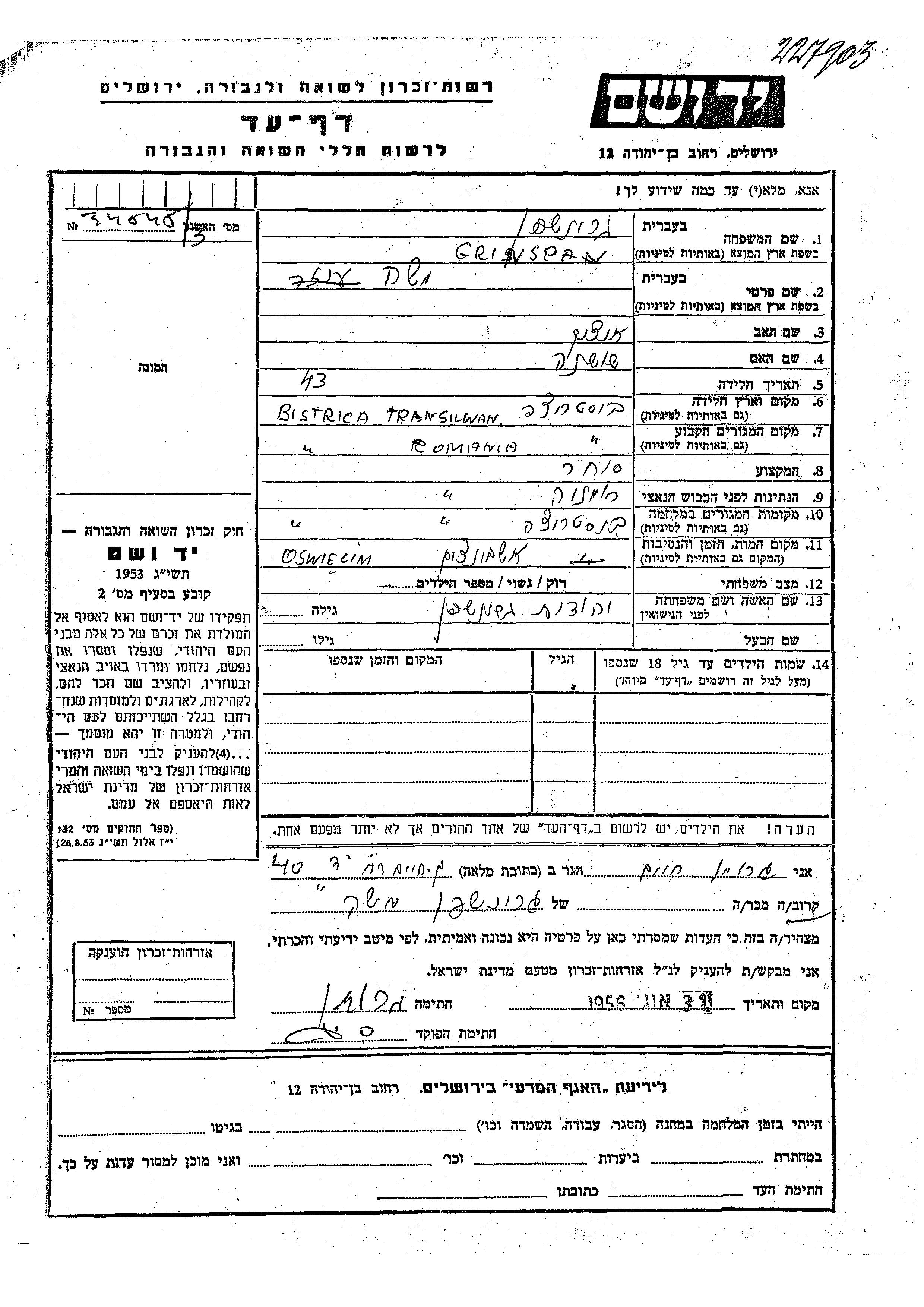 Grinspan Moshe Bistrica, Romania Page of Testimony