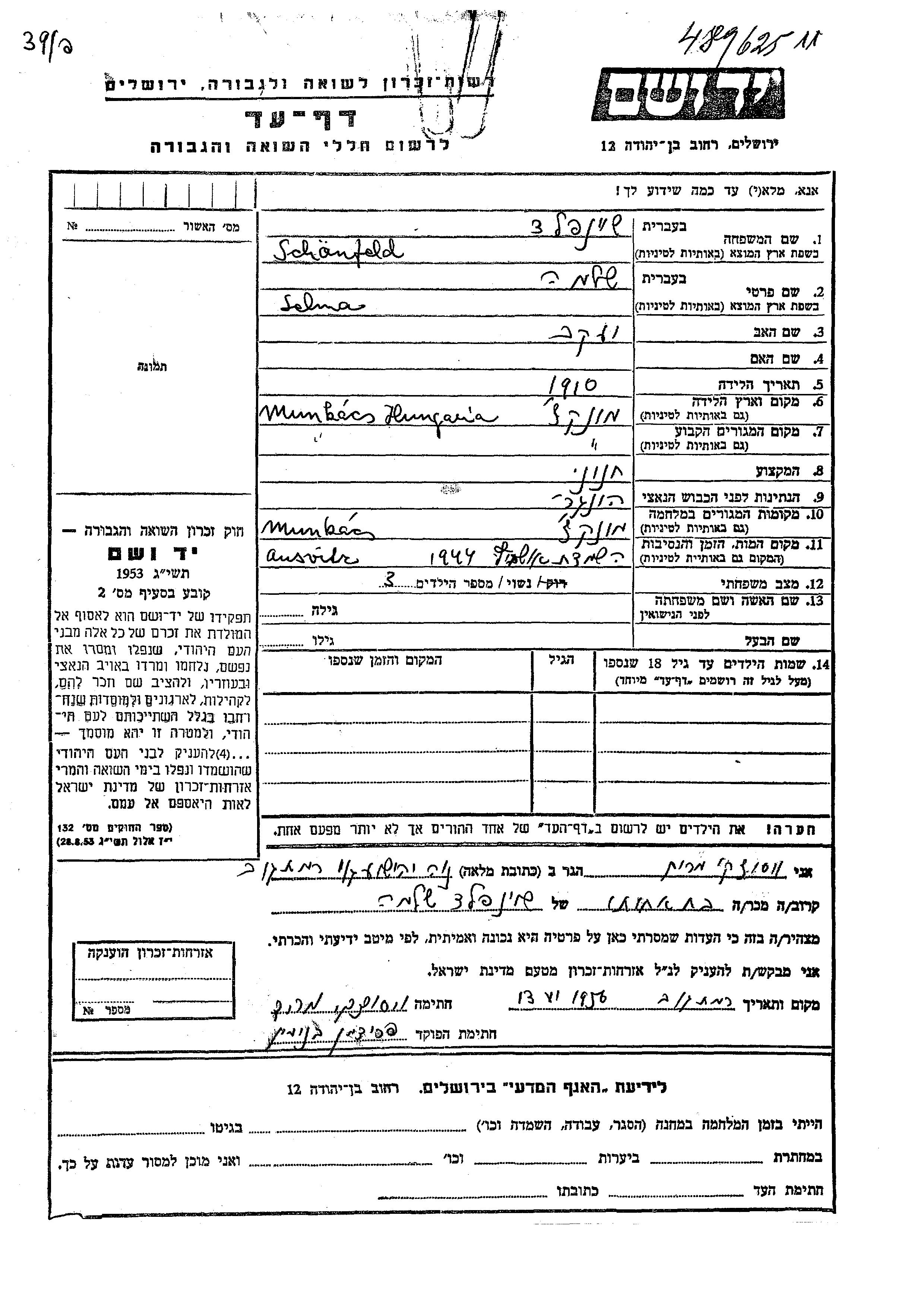 Schonfeld Sheinfeld Schloma 1910 Munkacs, Czechoslovakia Page of Testimony