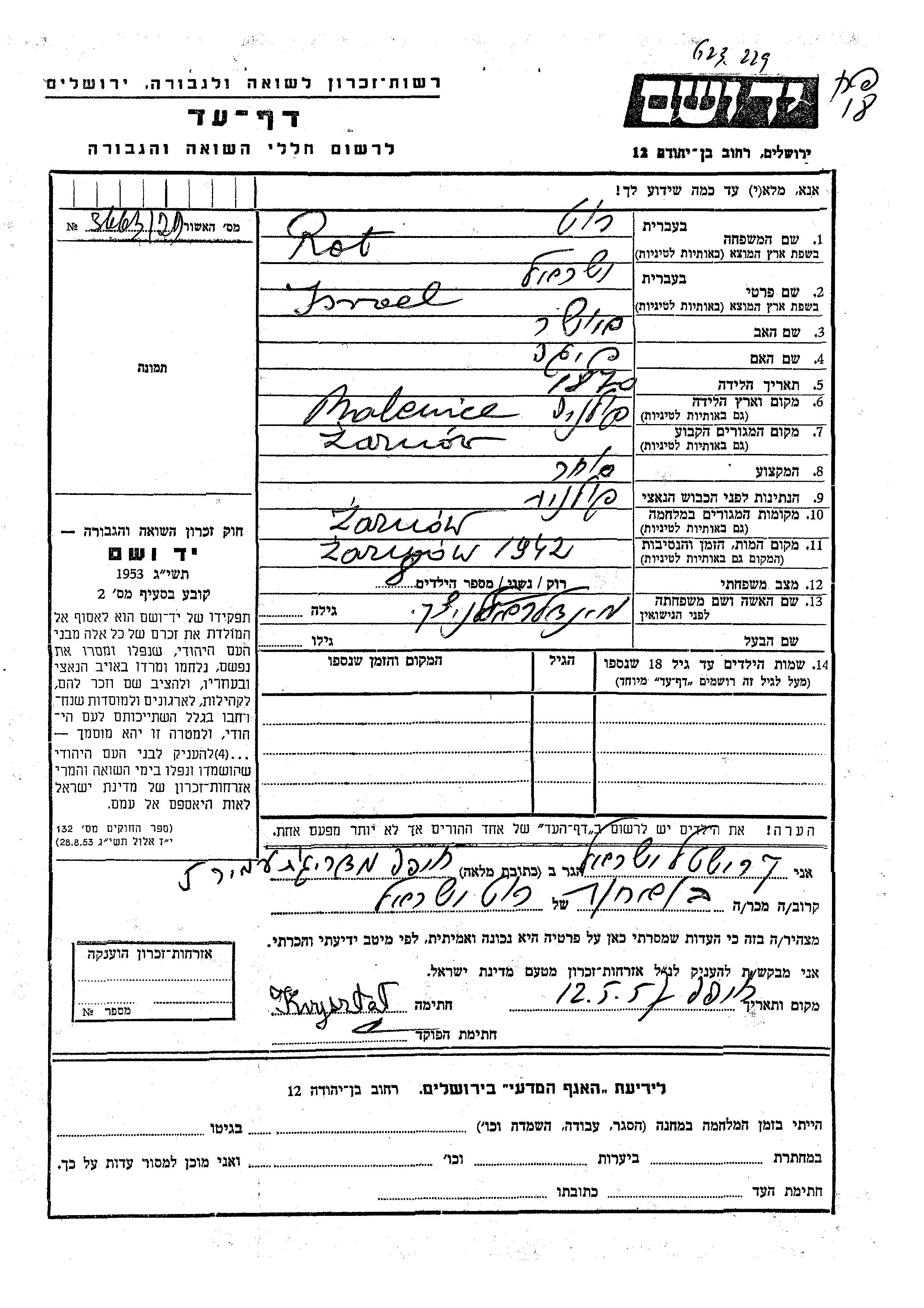 Israel Rot Rut was born in Maleniec, Poland, 1870 to Usher and Feiga. He was a merchant and married to Mindl nee Refelnitzki. Prior to WWII he lived in Zarnow, Poland. During the war he was in Zarnow, Poland. Israel was murdered in the Shoah. Place of death: Zarnow, Poland, 1942.