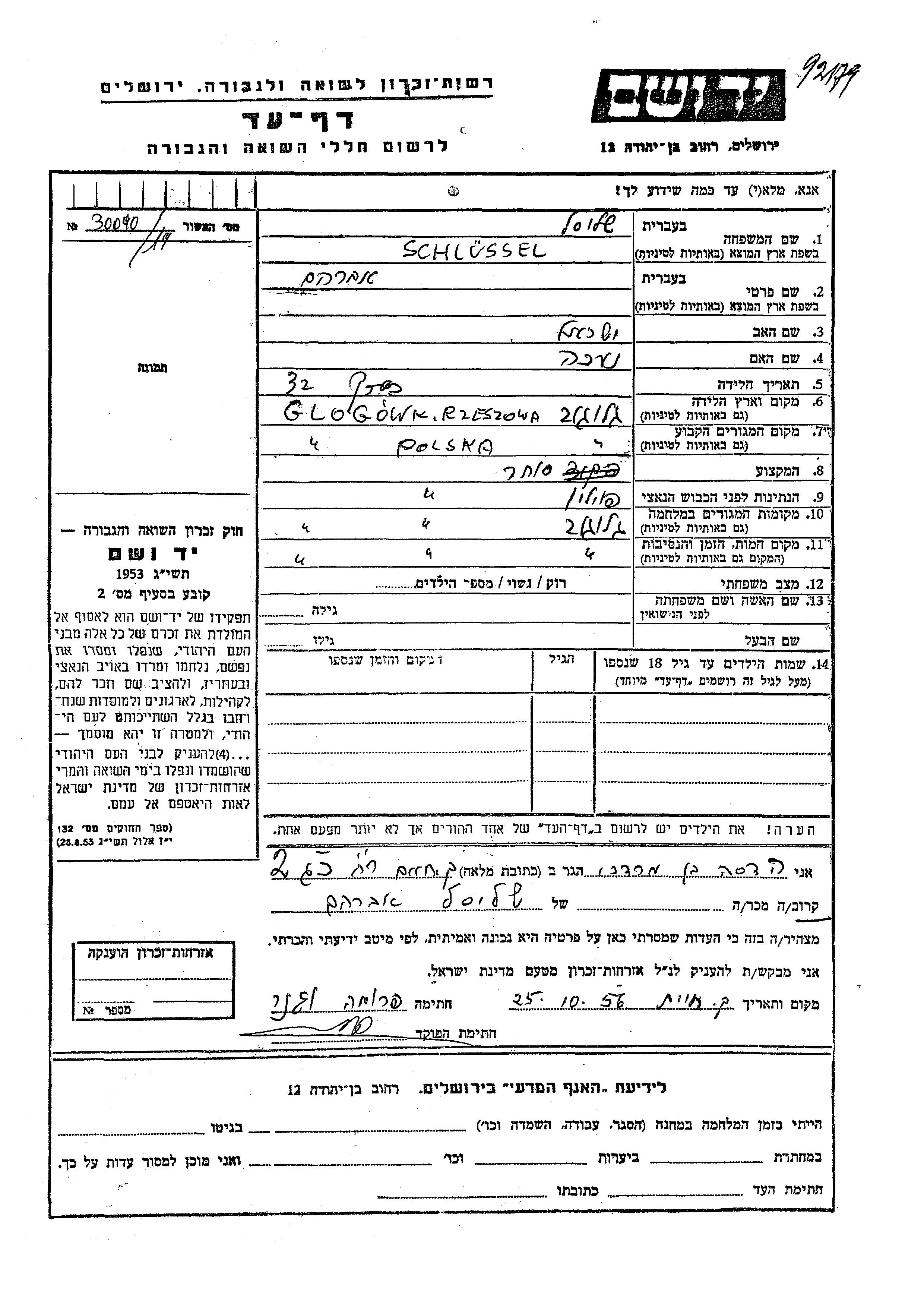Schlussel Avraham Glogow, Poland Page of Testimony