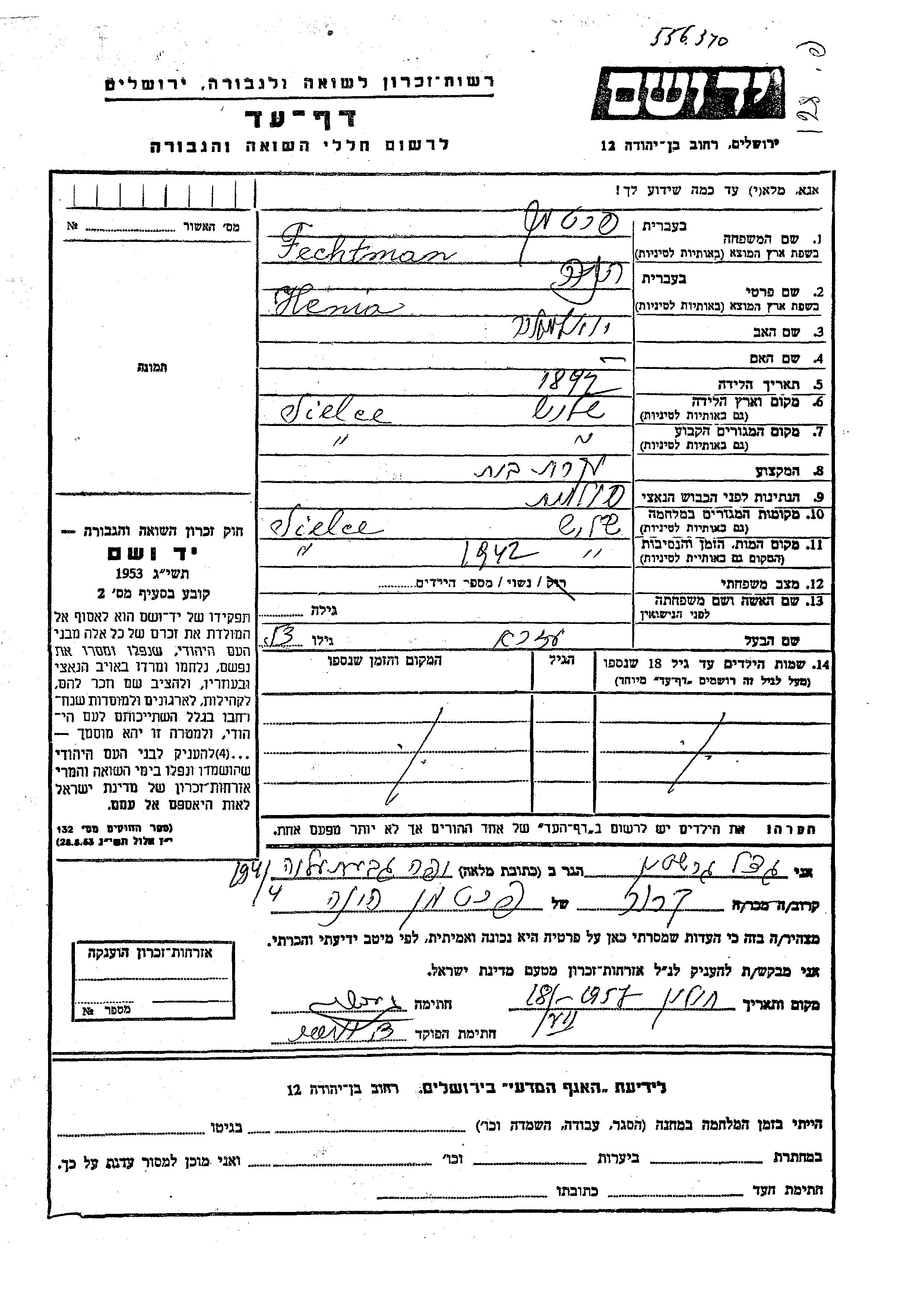 Henia Fechtman Pakhtman was born in Sielec, Poland, 1894 to Yoel Meir. She was a housewife and married to Ezra. Prior to WWII she lived in Sielec, Poland. During the war she was in Sielec, Poland. Henia was murdered in the Shoah. Place of death: Sielec, Poland, 1942.