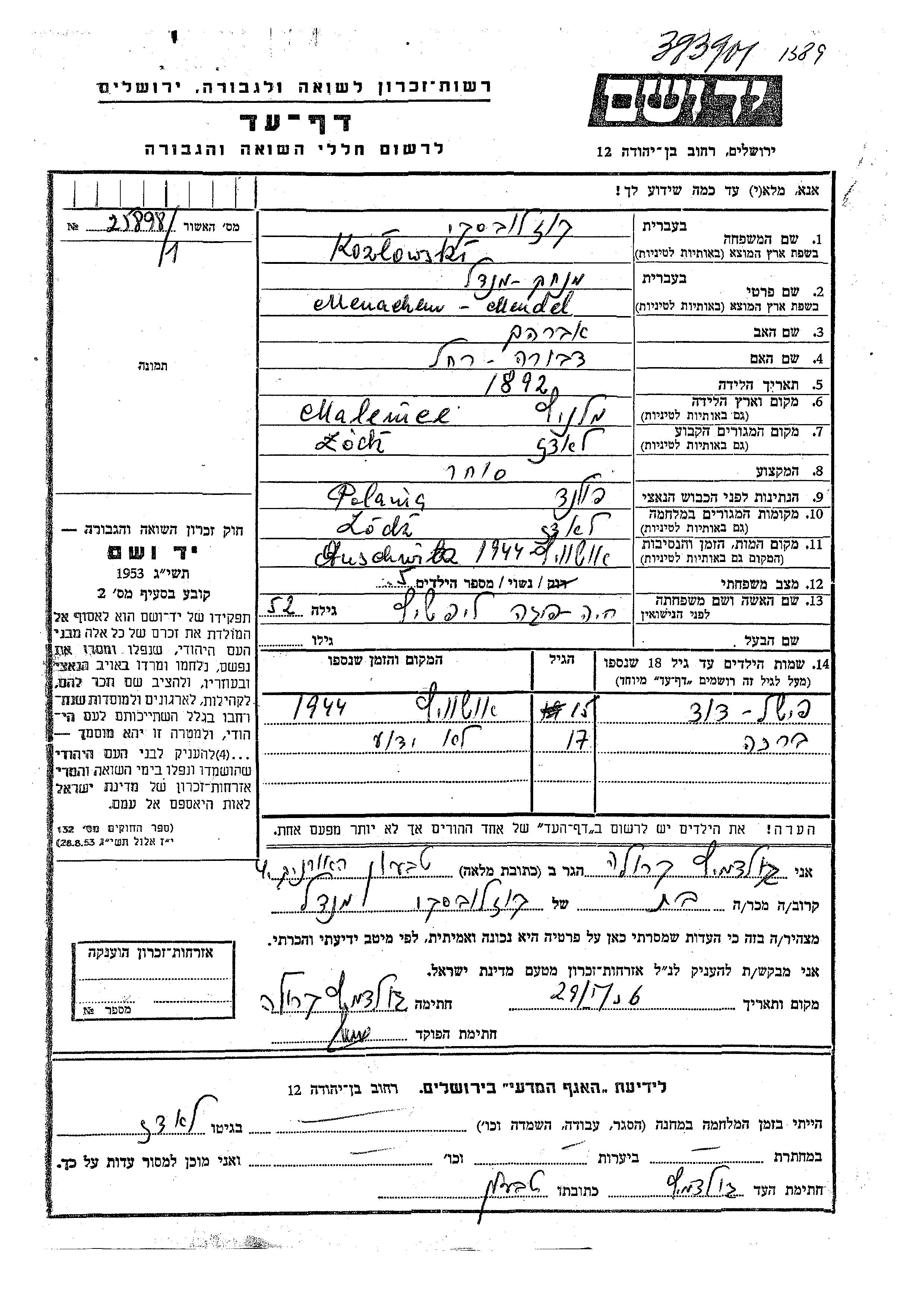 Menachem Mendel Kozlowski was born in Maleniec, Poland, 1892 to Avraham and Dvora Rakhel. He was a merchant and married to Khaia Feiga nee Lifshitz. Prior to WWII he lived in Lodz, Poland. During the war he was in Lodz, Poland. Menachem Mendel was murdered in the Shoah. Place of death: Auschwitz, Poland, 1944.