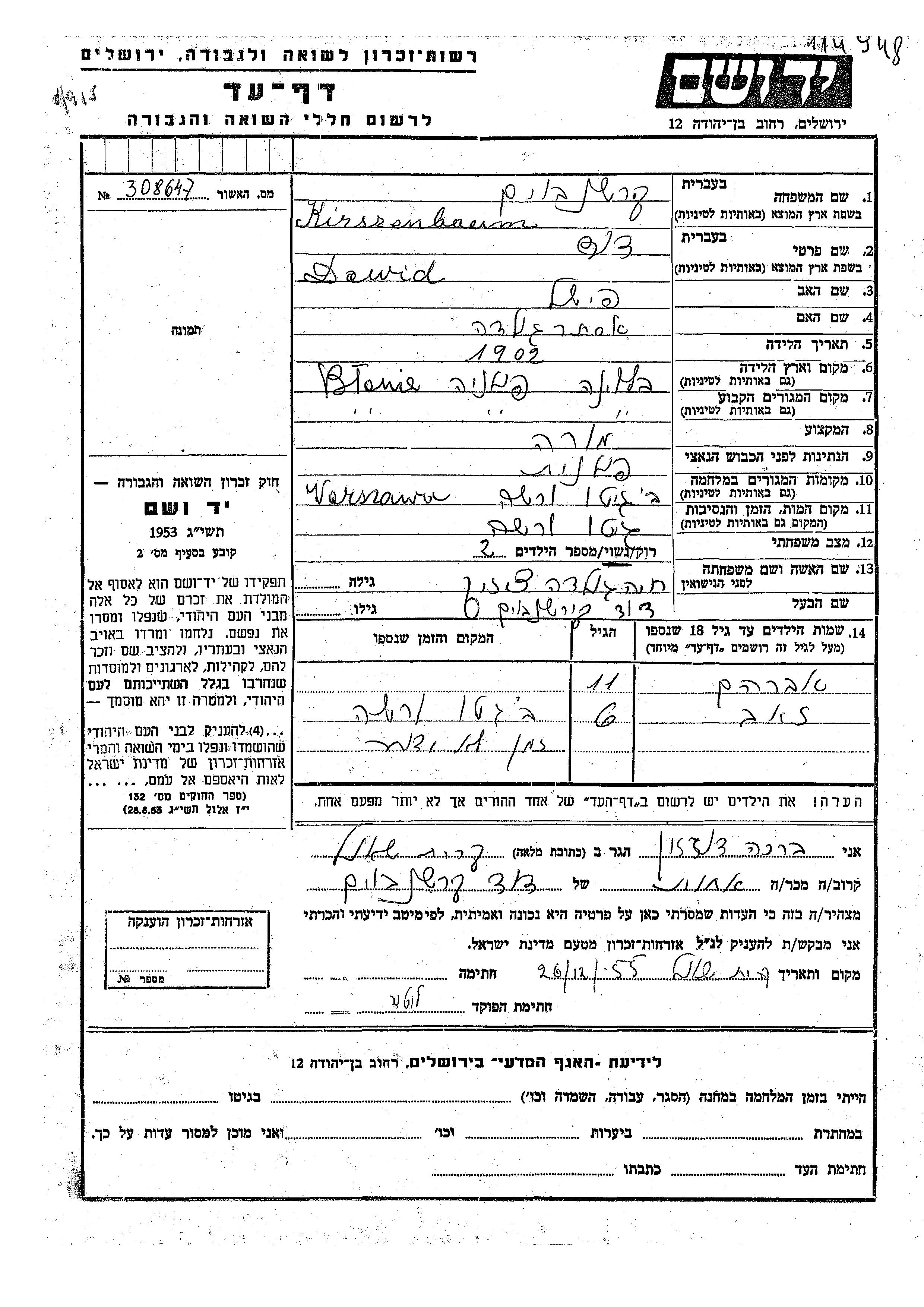Dawid Kirshenboim was born in Blonie, Poland, 1902 to Fishel and Ester Golda. He was a teacher and married to Khaia Golda nee Chizik. Prior to WWII he lived in Blonie, Poland. During the war he was in Warsaw, Poland. Dawid was murdered in the Shoah. Place of death: Warsaw, Poland.
