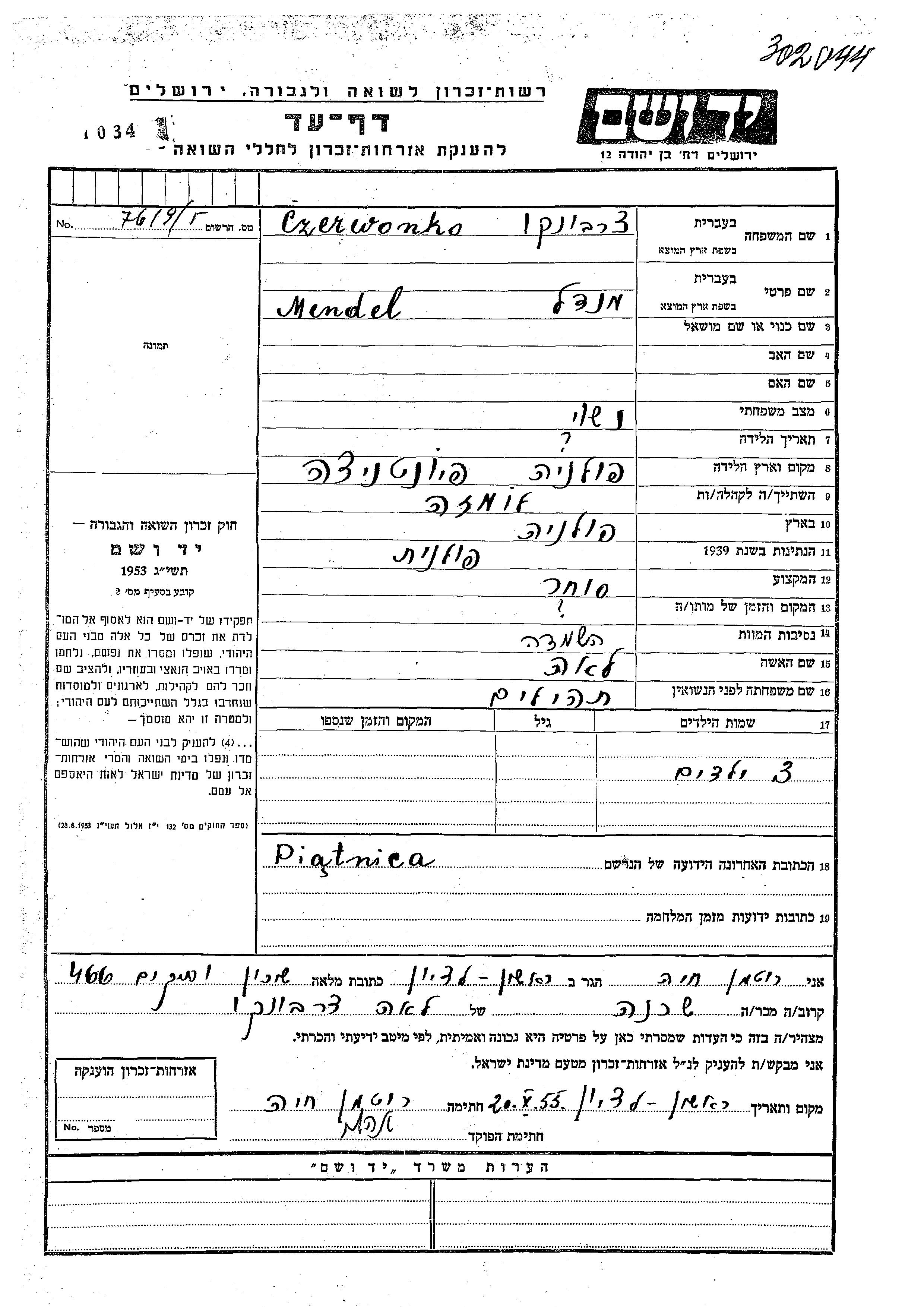 Czerwonko Mendel unstated place, Page of Testimony
