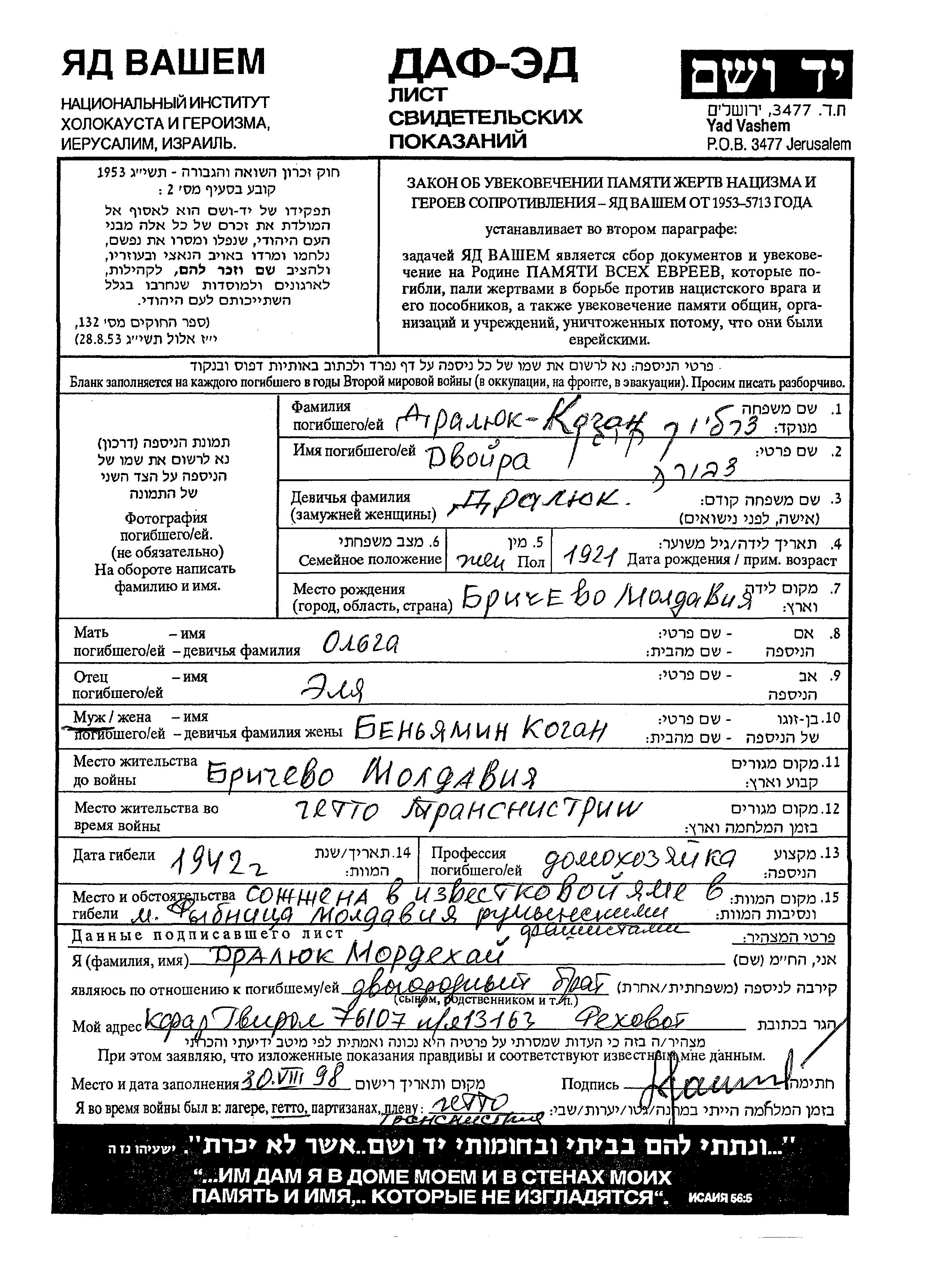 Dvoira Dralyuk nee Kogan was born in Brichevo, Romania, 1921 to Elya and Olga. She was a housewife and married to Beniamin. Prior to WWII she lived in Brichevo, Romania. During the war she was in Transnistria, Ukraine (USSR). Dvoira was murdered in the Shoah. Place of death: Rybnitsa, Ukraine (USSR), 1942.