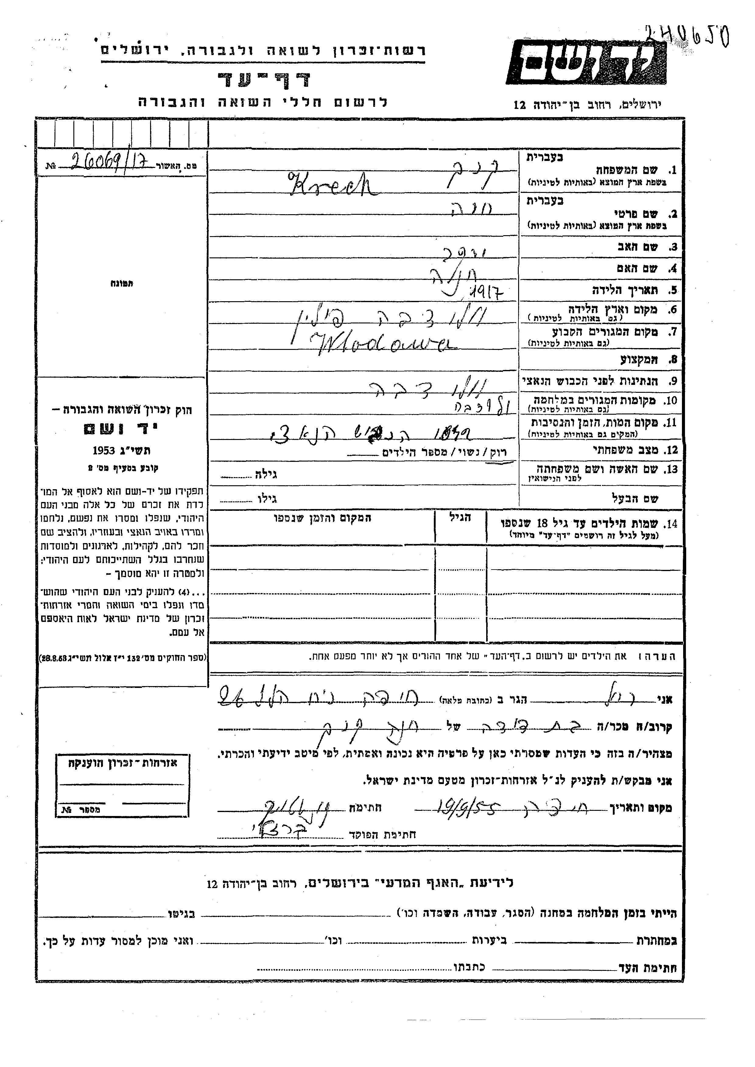 Khava Krech was born in Wlodowice, Poland, 1917 to Yitzkhak and Khana. She was single. Prior to WWII she lived in Wlodowice, Poland. During the war she was in Wlodowice, Poland. Khava was murdered in the Shoah. Place of death: unknown, 1942.