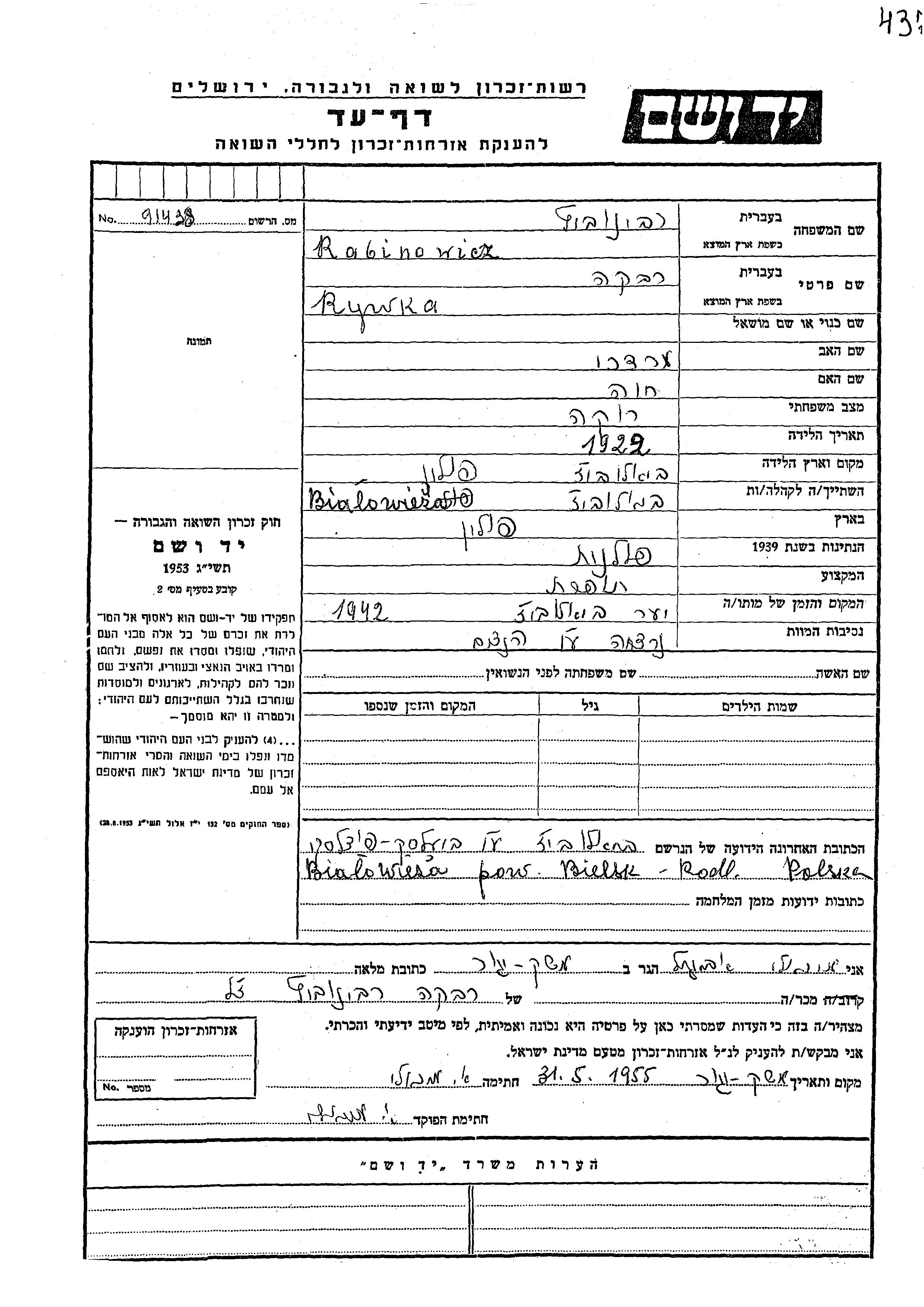 Rywka Rabinowicz was born in Bialowieza, Poland, 1922 to Mordekhai and Khava. She was a seamstress. Prior to WWII she lived in Bialowieza, Poland. During the war she was in Bialowieza, Poland. Rywka was murdered in the Shoah. Place of death: Bialowieza, Poland, 1942.