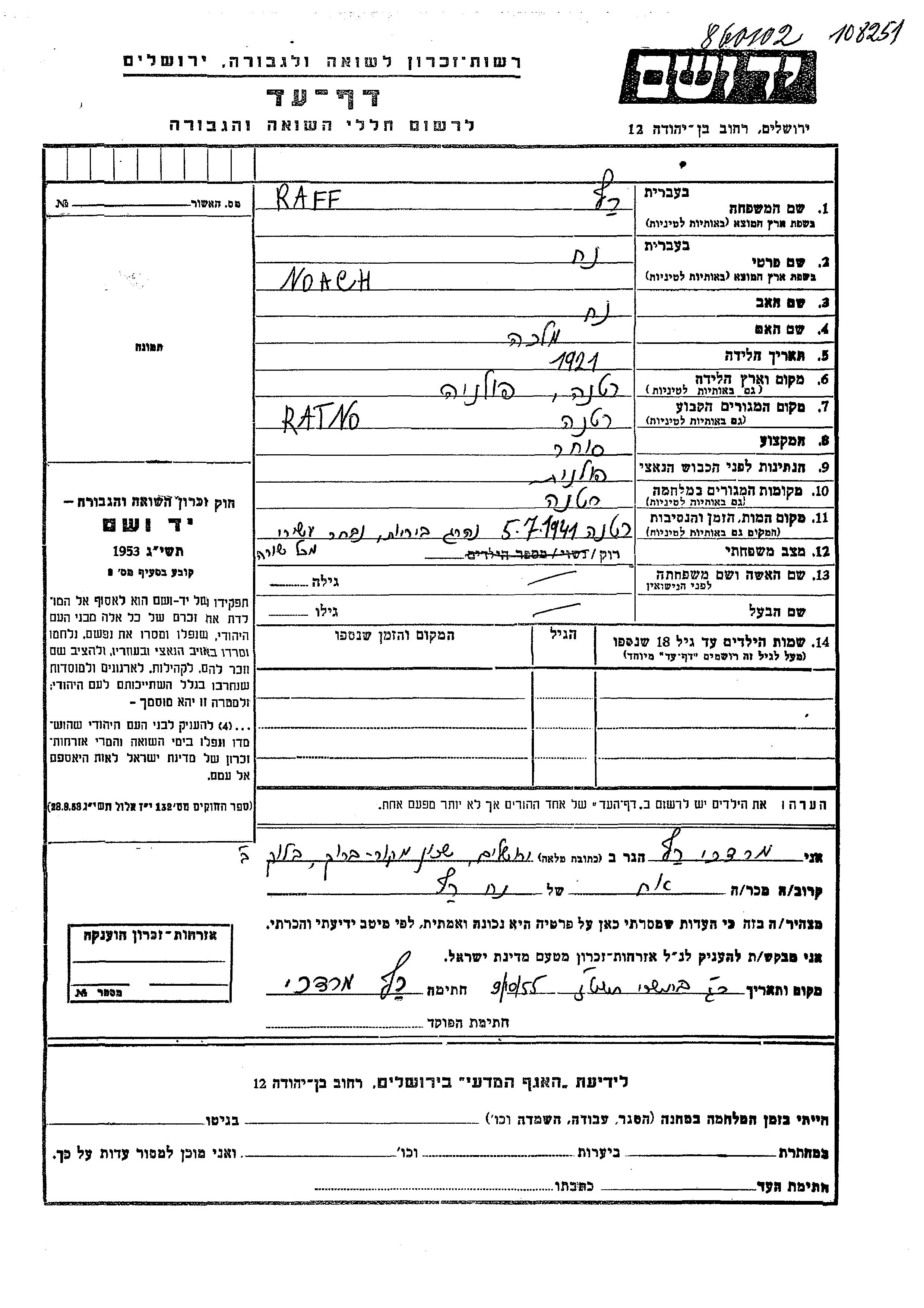 Raff Noach 1921 Ratno, Poland Page of Testimony
