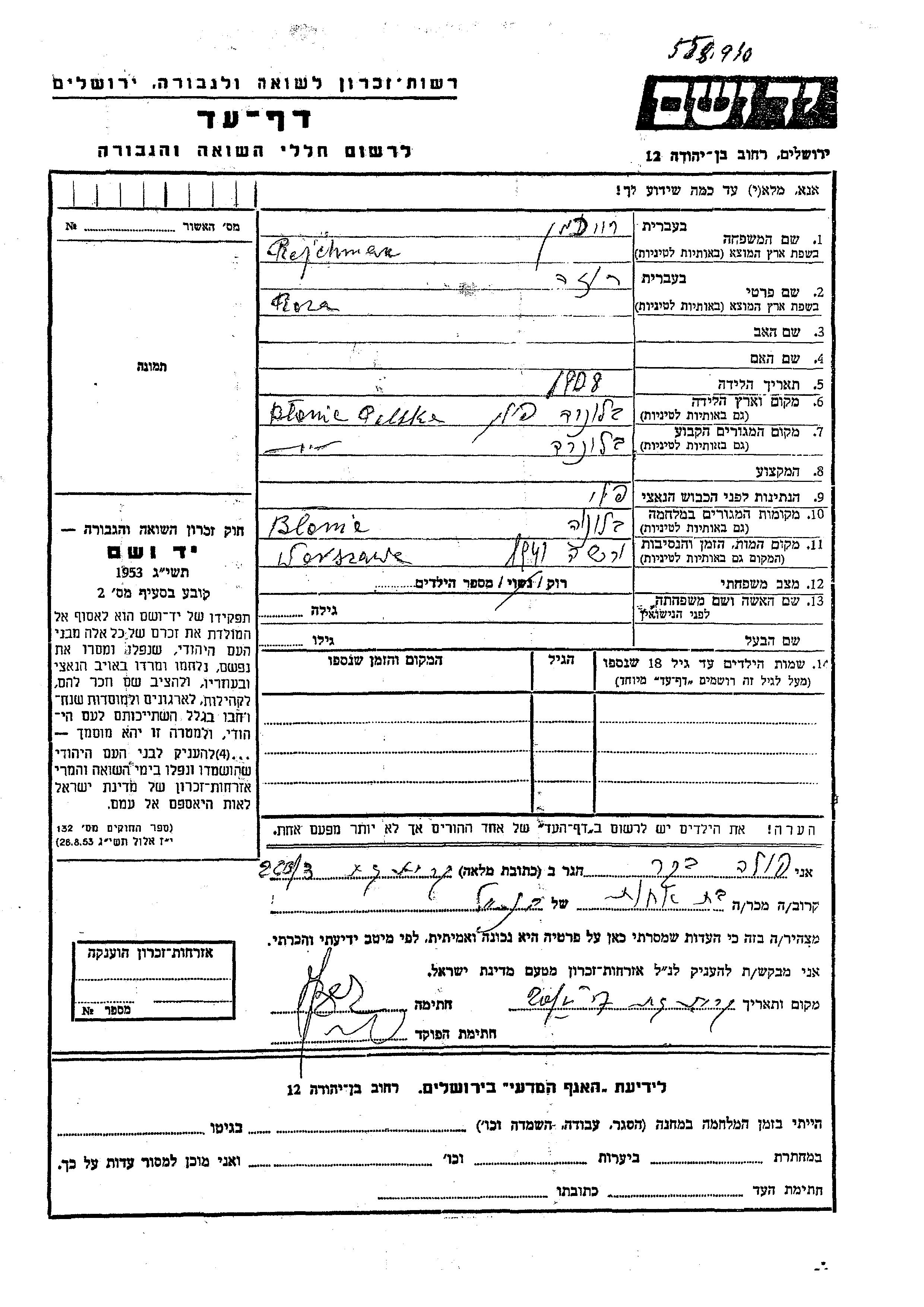 Roza Rajchman was born in Blonie, Poland, 1908. She was single. Prior to WWII she lived in Blonie, Poland. During the war she was in Blonie, Poland. Roza was murdered in the Shoah. Place of death: Warsaw, Poland, 1941.