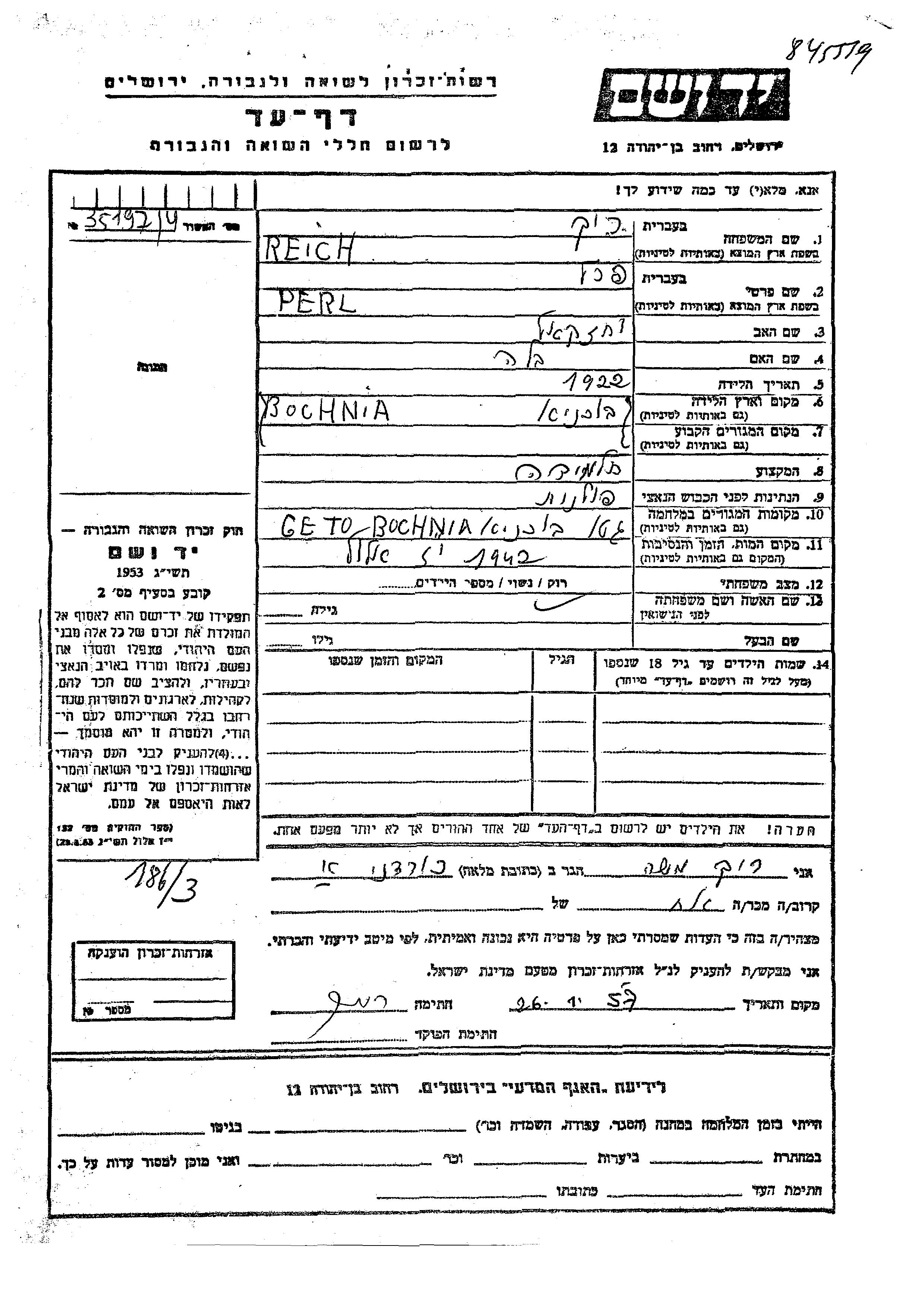 Reich Perl 1922 unstated place, Page of Testimony