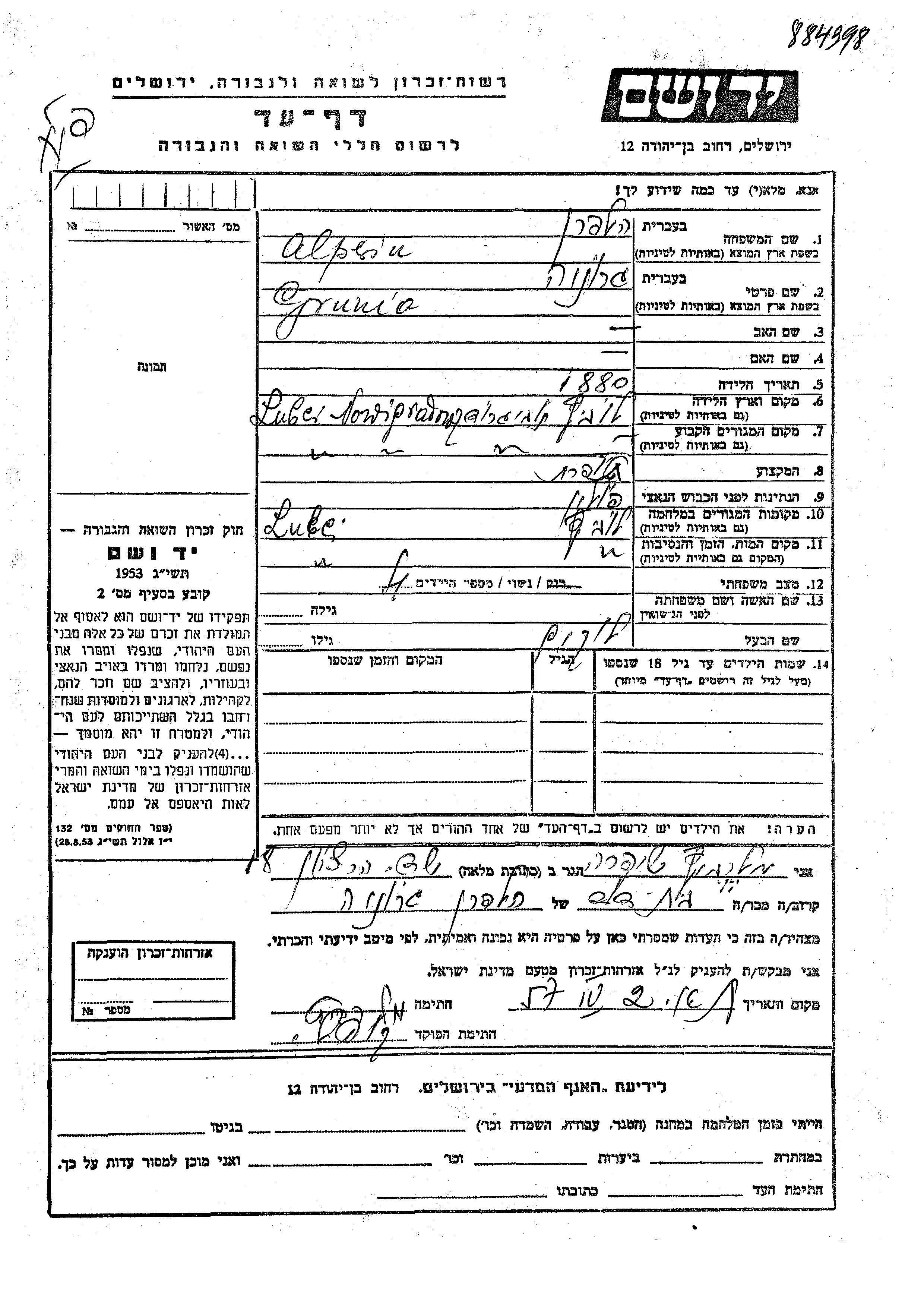 Grunia Alperin Halpern was born in Lubcz, Poland, 1880. She was a seamstress and married to Lukim. Prior to WWII she lived in Lubcz, Poland. During the war she was in Lubcz, Poland. Grunia was murdered in the Shoah. Place of death: Lubcz, Poland.