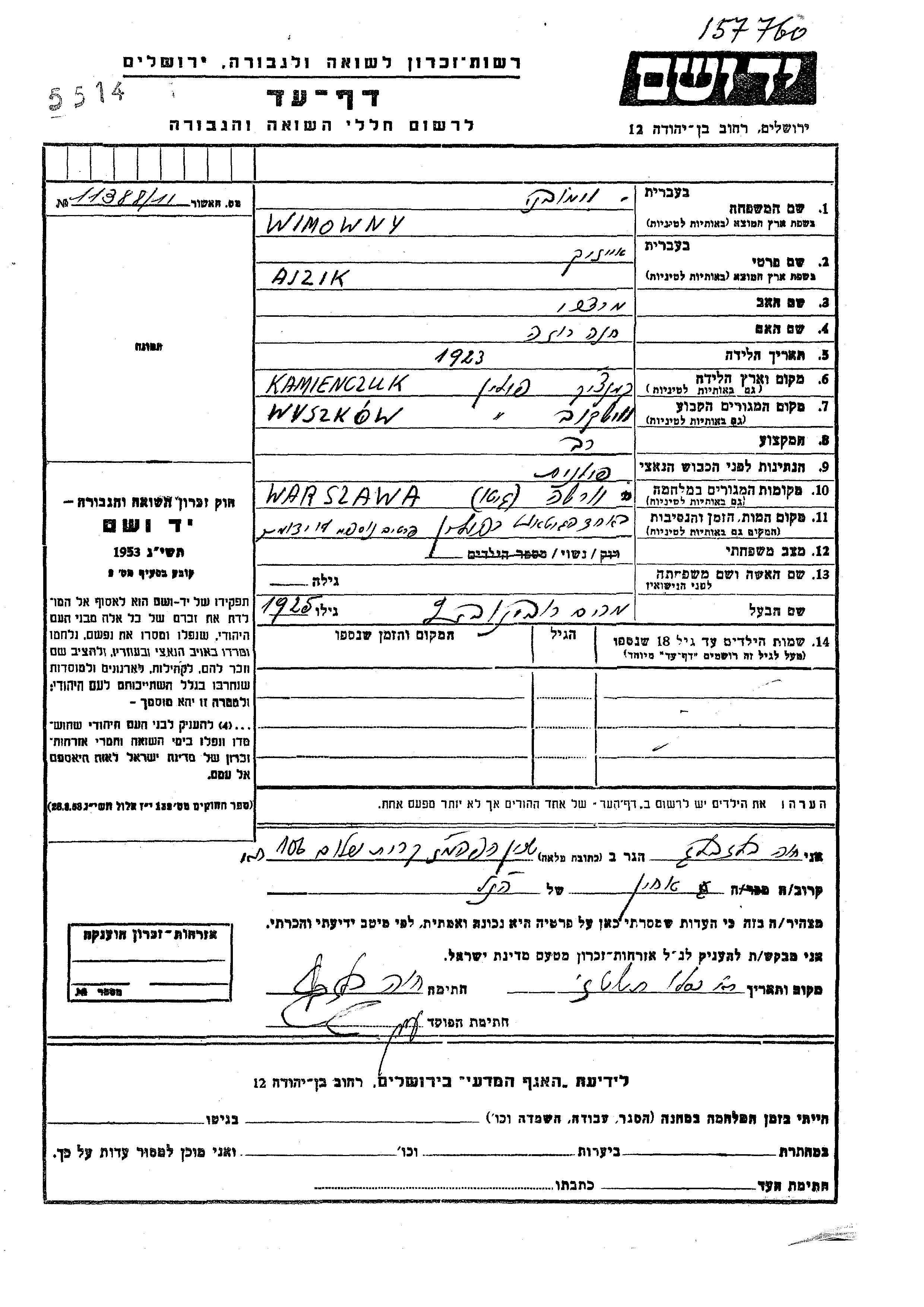 Ajzik Wimowny was born in Kamienczyk, Poland, 1923 to Mordekhai and Khana Roza. He was a rabbi and married to Miriam nee Rubinovitz. Prior to WWII he lived in Wyszkow, Poland. During the war he was in Warszawa, Poland. Ajzik was murdered in the Shoah.