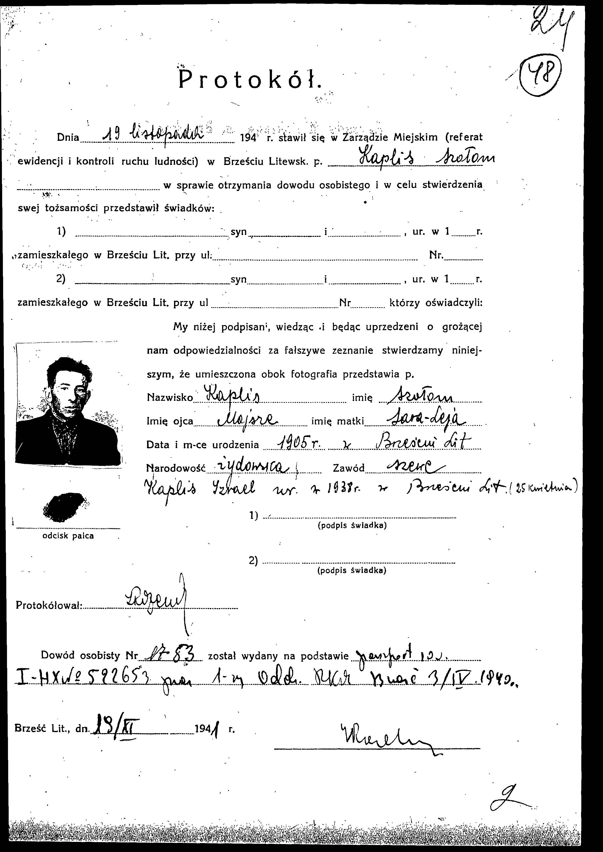 Izrael Kaplis was born, 1938 to Szlomo. He was child. During the war he was in Brest Litovsk, Poland.