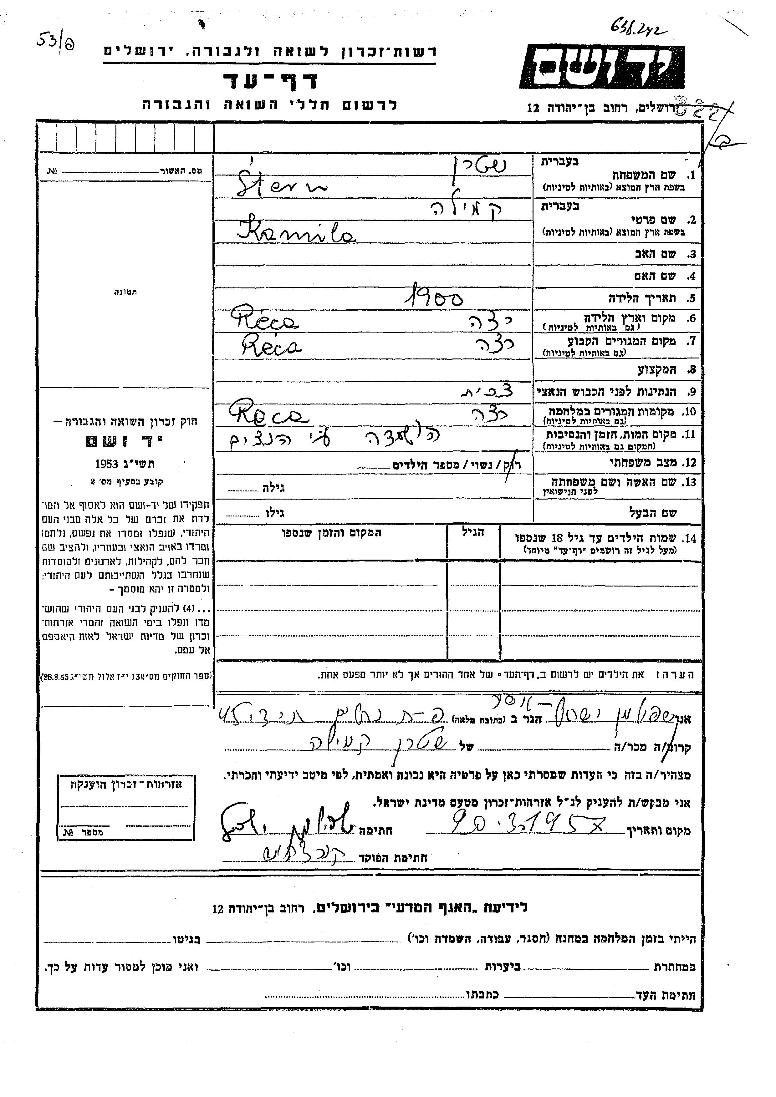 Stern Kamila 1900 Reca, Czechoslovakia Page of Testimony