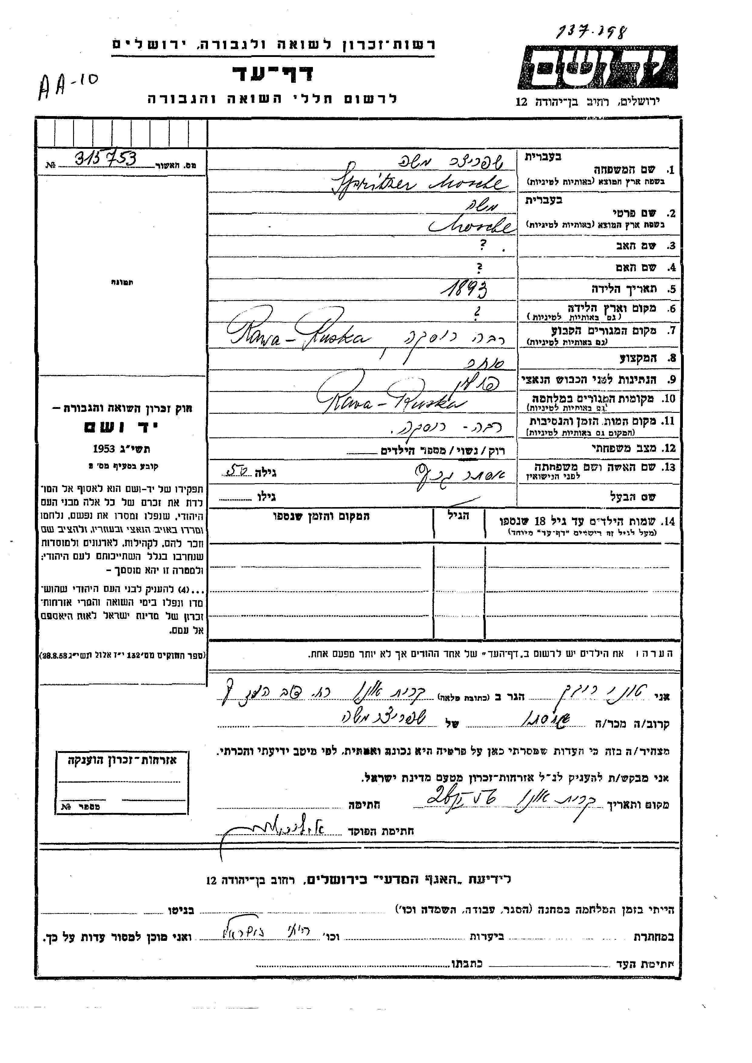 Spritzer Mosche 1893 Rawa Ruska, Poland Page of Testimony