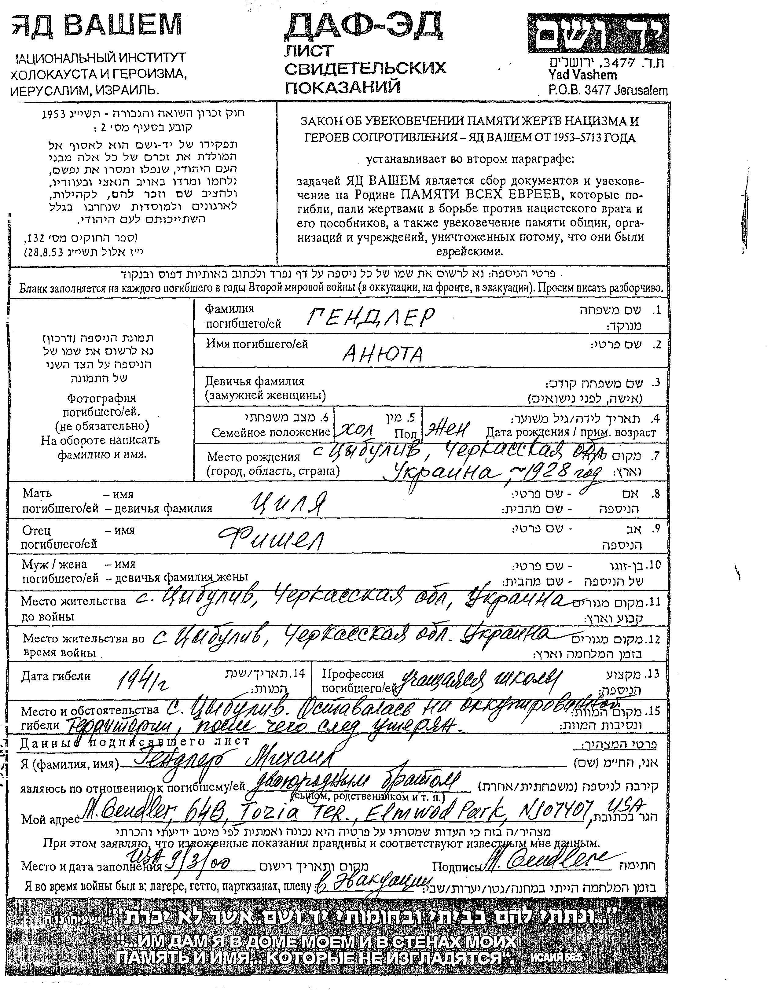 Anyuta Gendler was born in Tsybulev, Ukraine (USSR), 1928 to Fishel and Tzilya. She was a schoolgirl and single. Prior to WWII she lived in Tsybulev, Ukraine (USSR). During the war she was in Tsybulev, Ukraine (USSR). Anyuta was murdered in the Shoah. Place of death: Tsybulev, Ukraine (USSR), 1941.