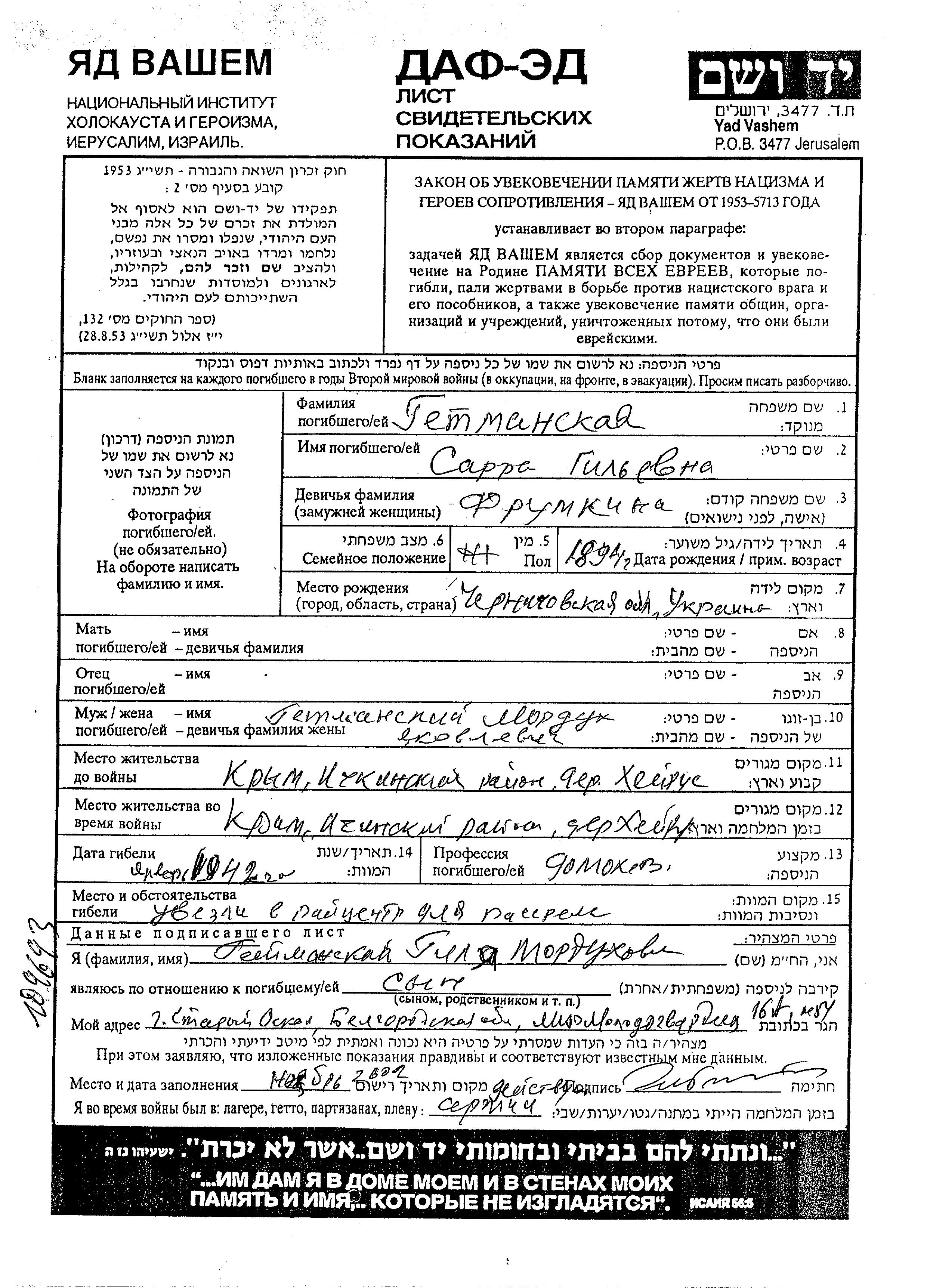 Sarra Getmanskaya nee Frumkina was born in Chernigov, Ukraine (USSR), 1894 to Gil. She was a housewife and married to Mordukh. Prior to WWII she lived in Kheyrus, Russia (USSR). During the war she was in Kheyrus, Russia (USSR). Sarra was murdered in the Shoah. Place of death: Ichki, Russia (USSR), 00/01/1942.