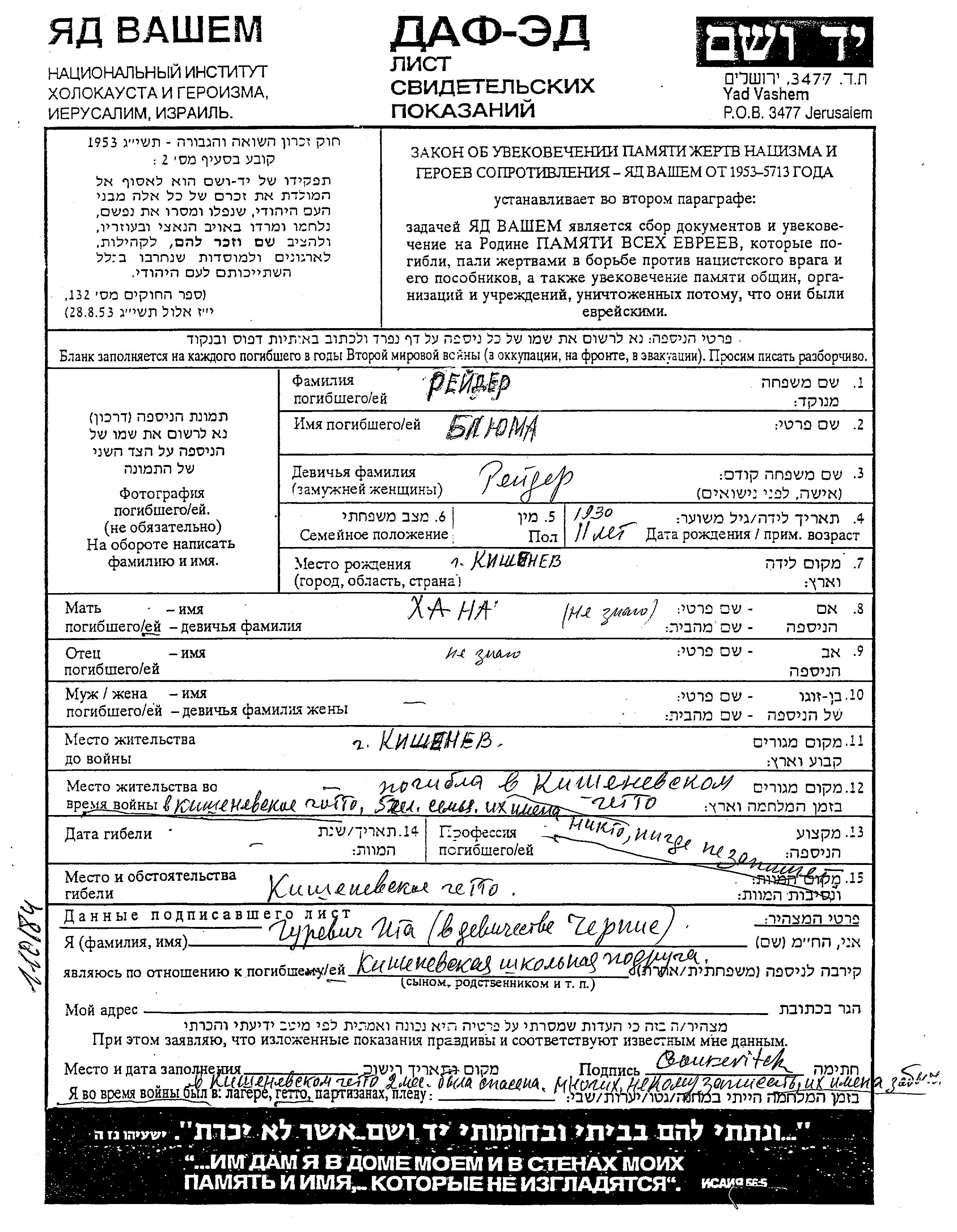 Reider Blyuma 1930 Kishiniov, Romania Page of Testimony