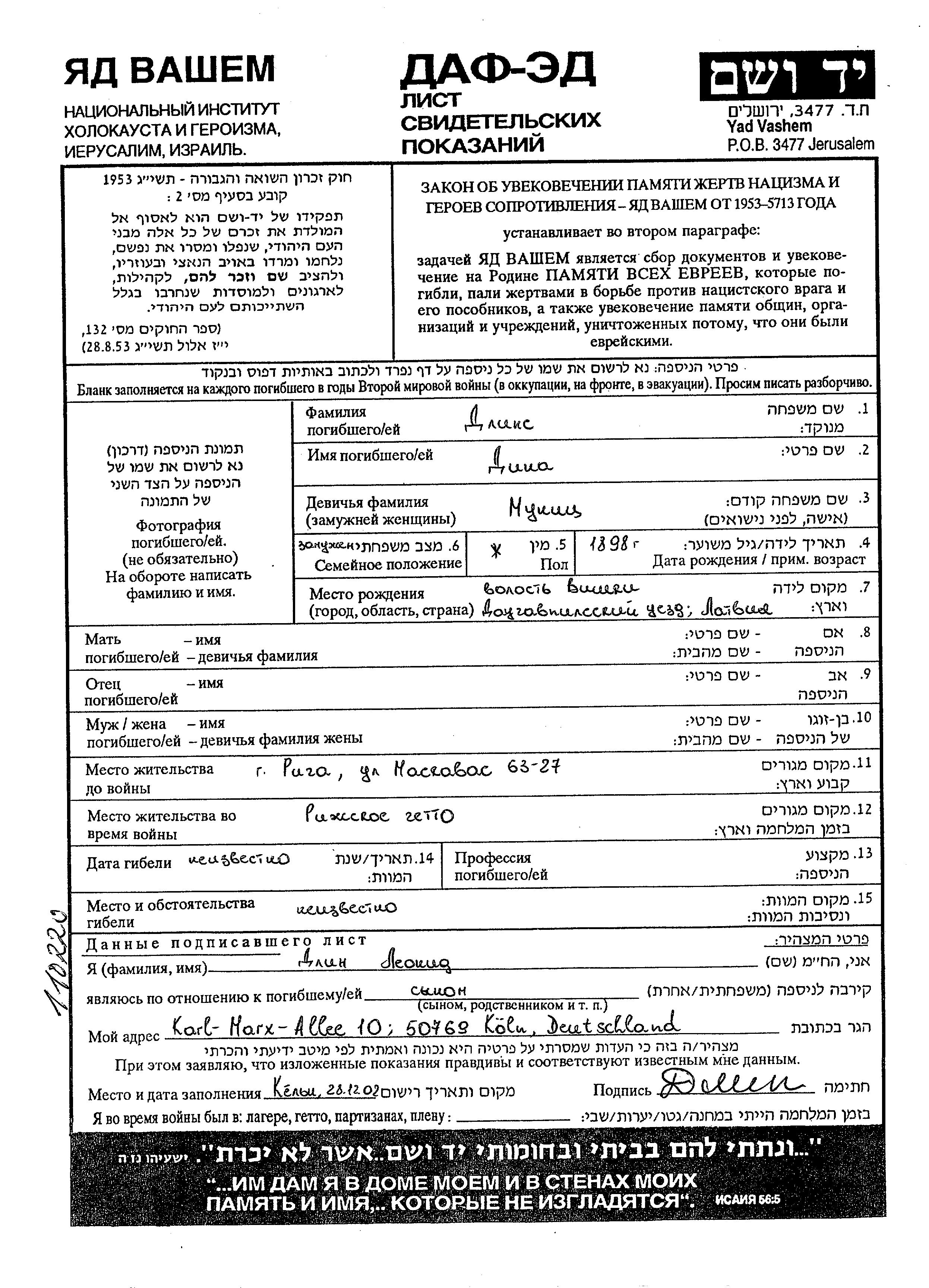Yad Vashem - Pages of Testimony Names Memorial Collection