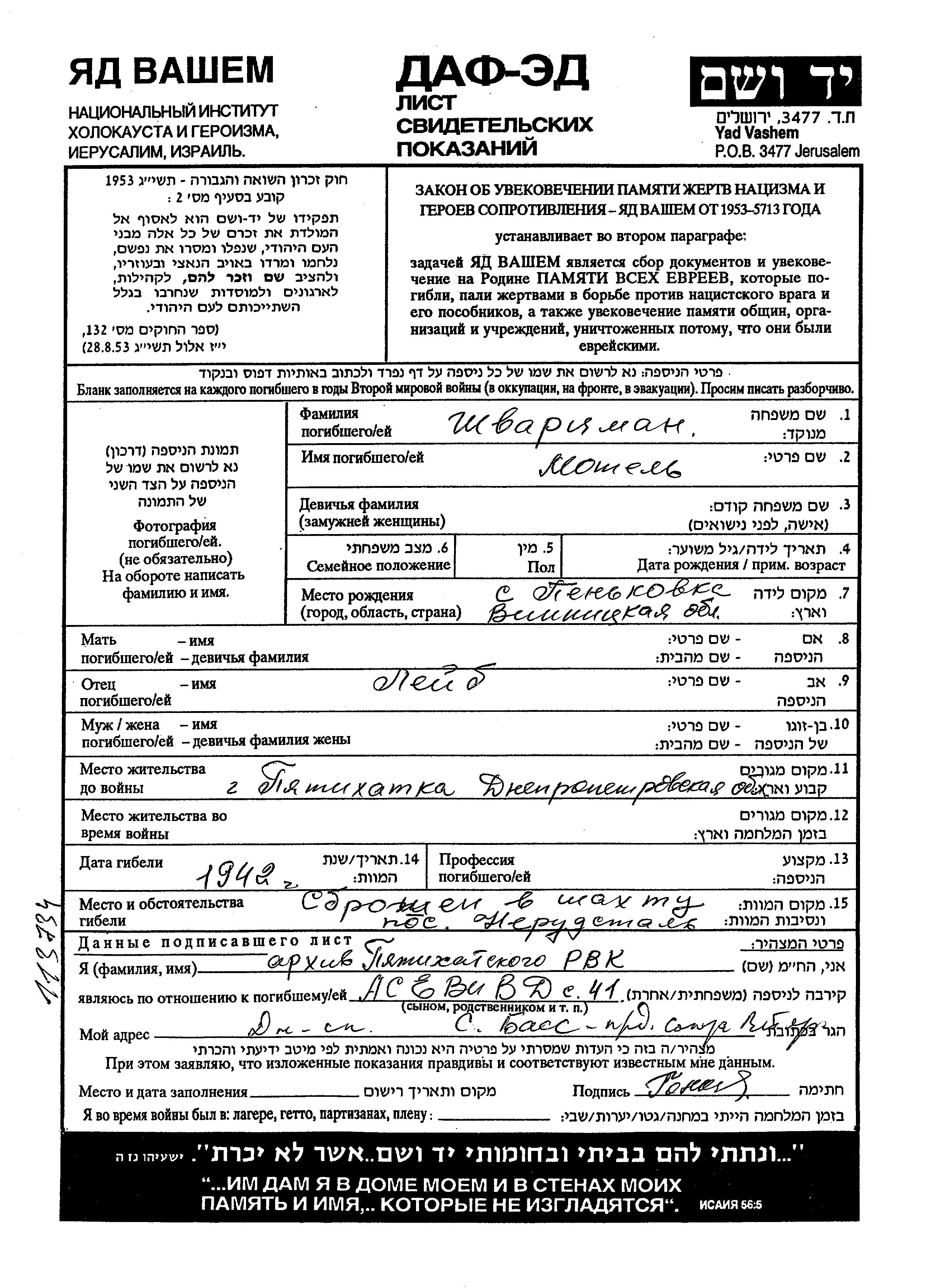 Motel Shwartzman was born in Penkovka, Ukraine (USSR) to Leib. Prior to WWII he lived in Pyatikhatka, Ukraine (USSR). During the war he was in Pyatikhatka, Ukraine (USSR). Motel was murdered in the Shoah. Place of death: Pyatikhatka, Ukraine (USSR), 1942.