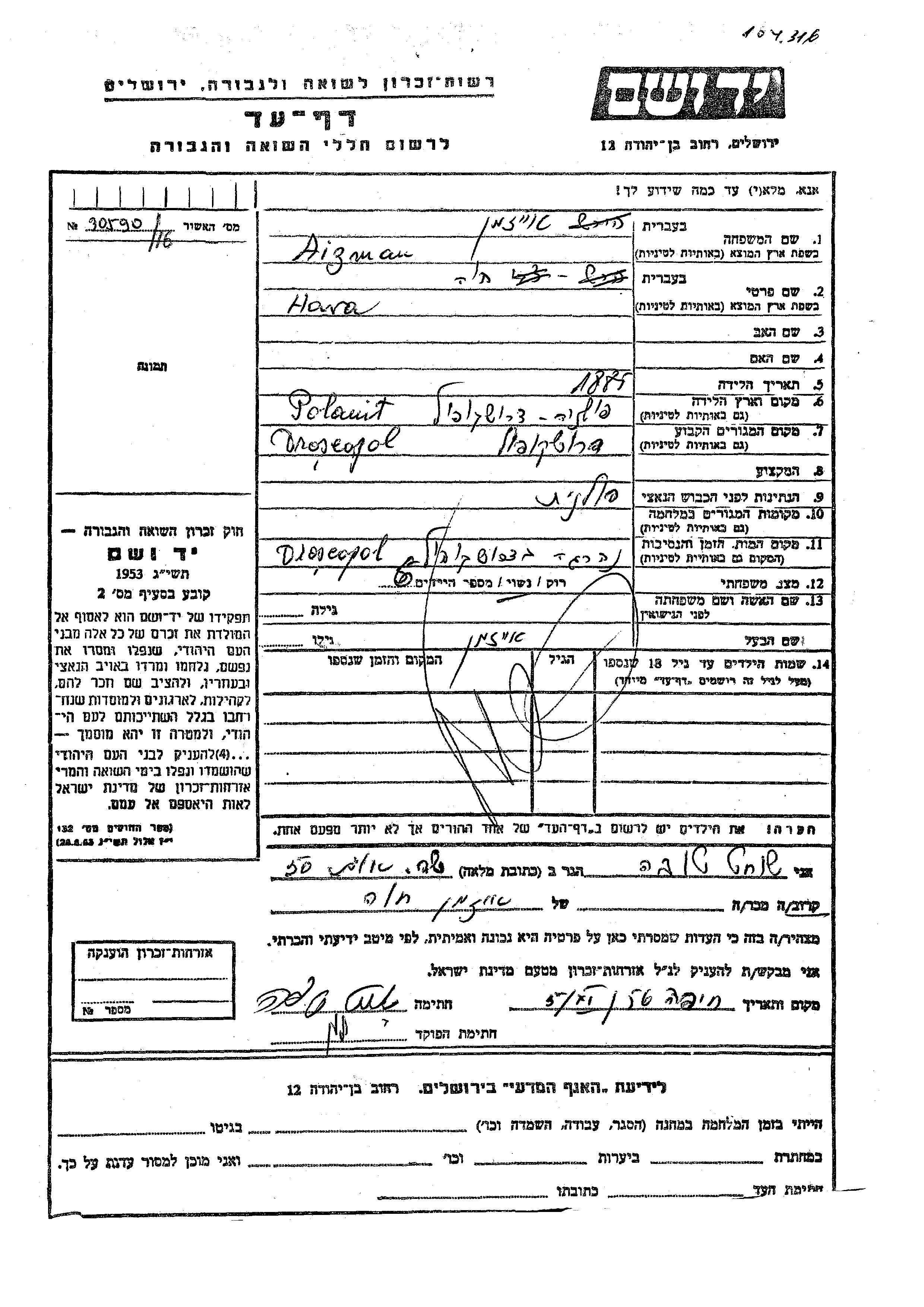 Aizman Hava 1885 Druzkopol, Poland Page of Testimony