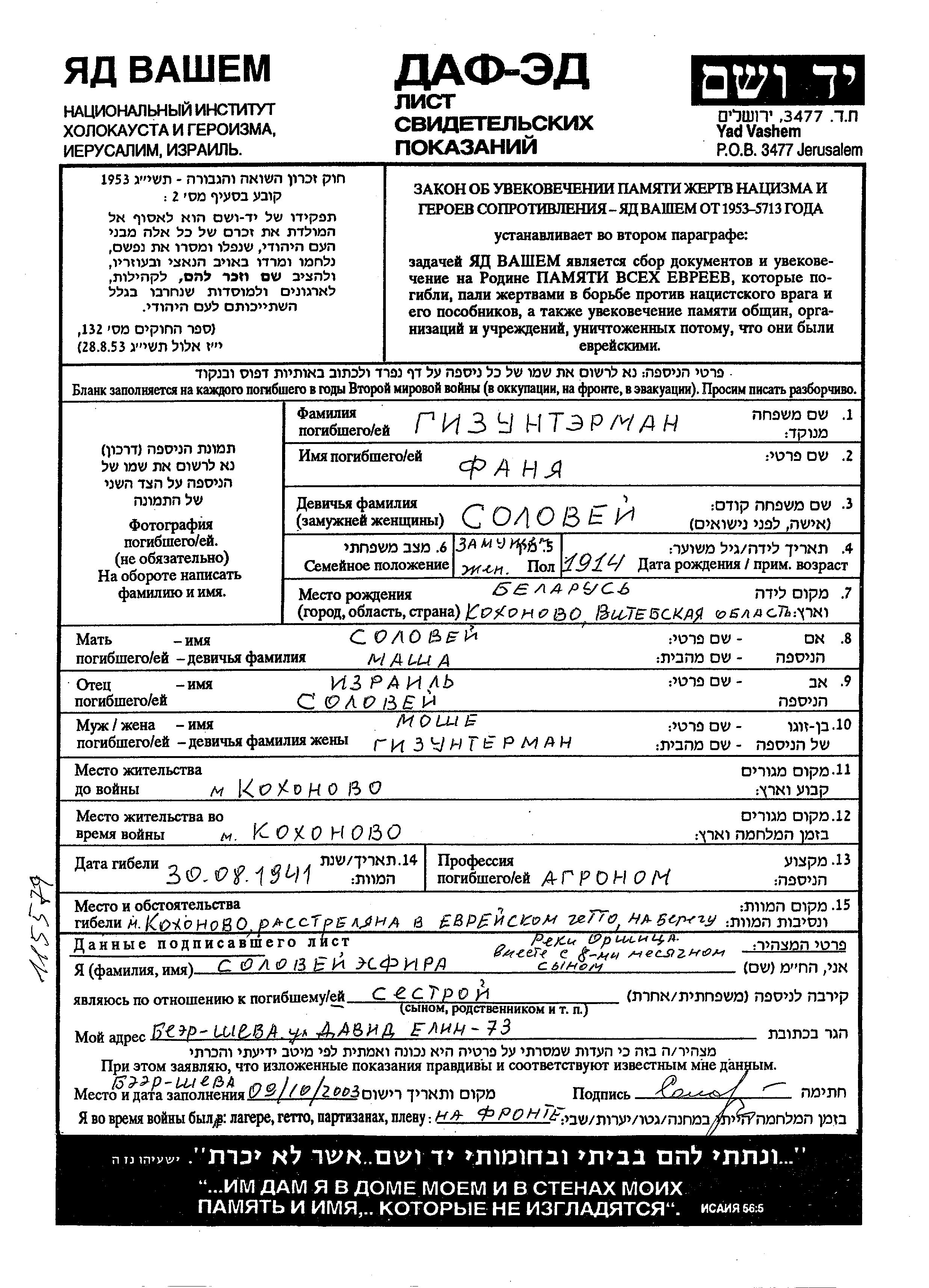 Fanya Gizunterman nee Solovei was born in Kokhanovo, Belorussia (USSR), 1914 to Izrail and Masha. She was an agronomist and married to Moshe nee Gizunterman. Prior to WWII she lived in Kokhanovo, Belorussia (USSR). During the war she was in Kokhanovo, Belorussia (USSR). Fanya was murdered in the Shoah. Place of death: Kokhanovo, Belorussia (USSR), 30/08/1941.