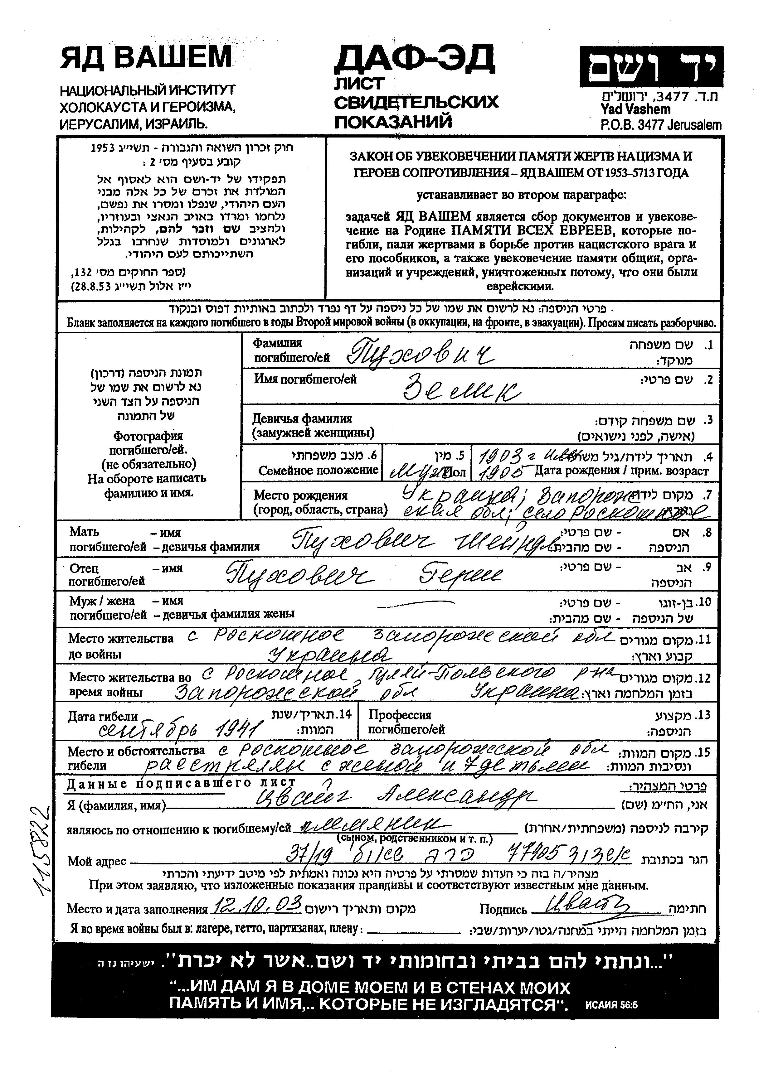 Zelik Pukhovich was born in Roskoshnoye, Ukraine (USSR), 1903 to Gersh and Sheindl. Prior to WWII he lived in Roskoshnoye, Ukraine (USSR). During the war he was in Roskoshnoye, Ukraine (USSR). Zelik was murdered in the Shoah. Place of death: Roskoshnoye, Ukraine (USSR), 00/09/1941.