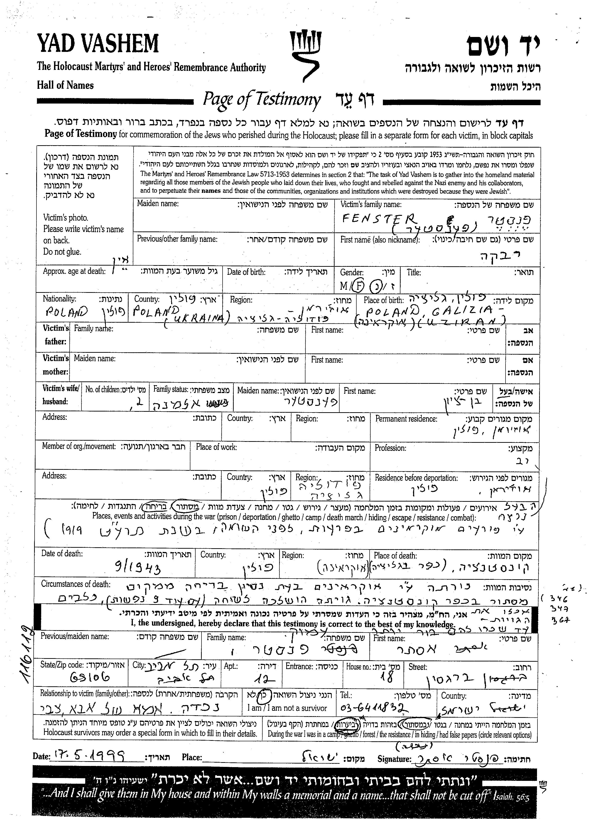 Rivka Fenster was born in Galicia Region, Poland. She was a widow of Bentzion. Prior to WWII she lived in Ozhiran, Poland. During the war she was in Ozhiran, Poland. Rivka was murdered in the Shoah. Place of death: Konstantsya, Poland, 1943.