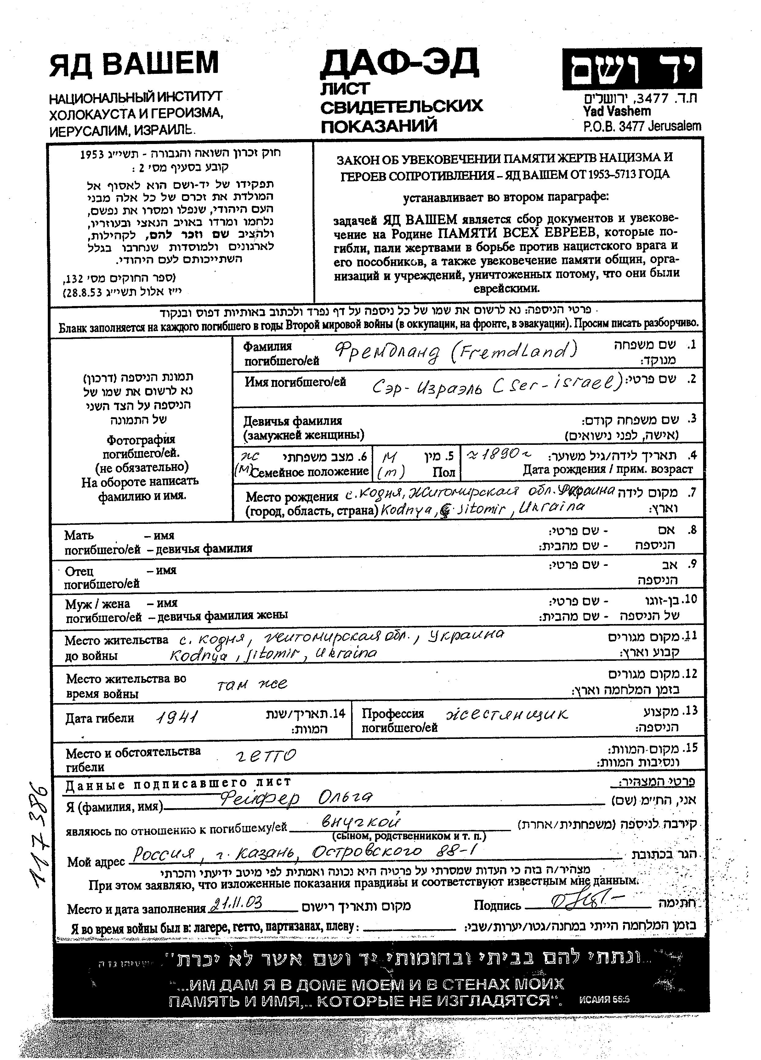 Ser Fremdland was born in Kodnja, Ukraine (USSR), 1890. He was a tinsmith. Prior to WWII he lived in Kodnja, Ukraine (USSR). During the war he was in Kodnja, Ukraine (USSR). Ser was murdered in the Shoah. Place of death: unknown, 1941.