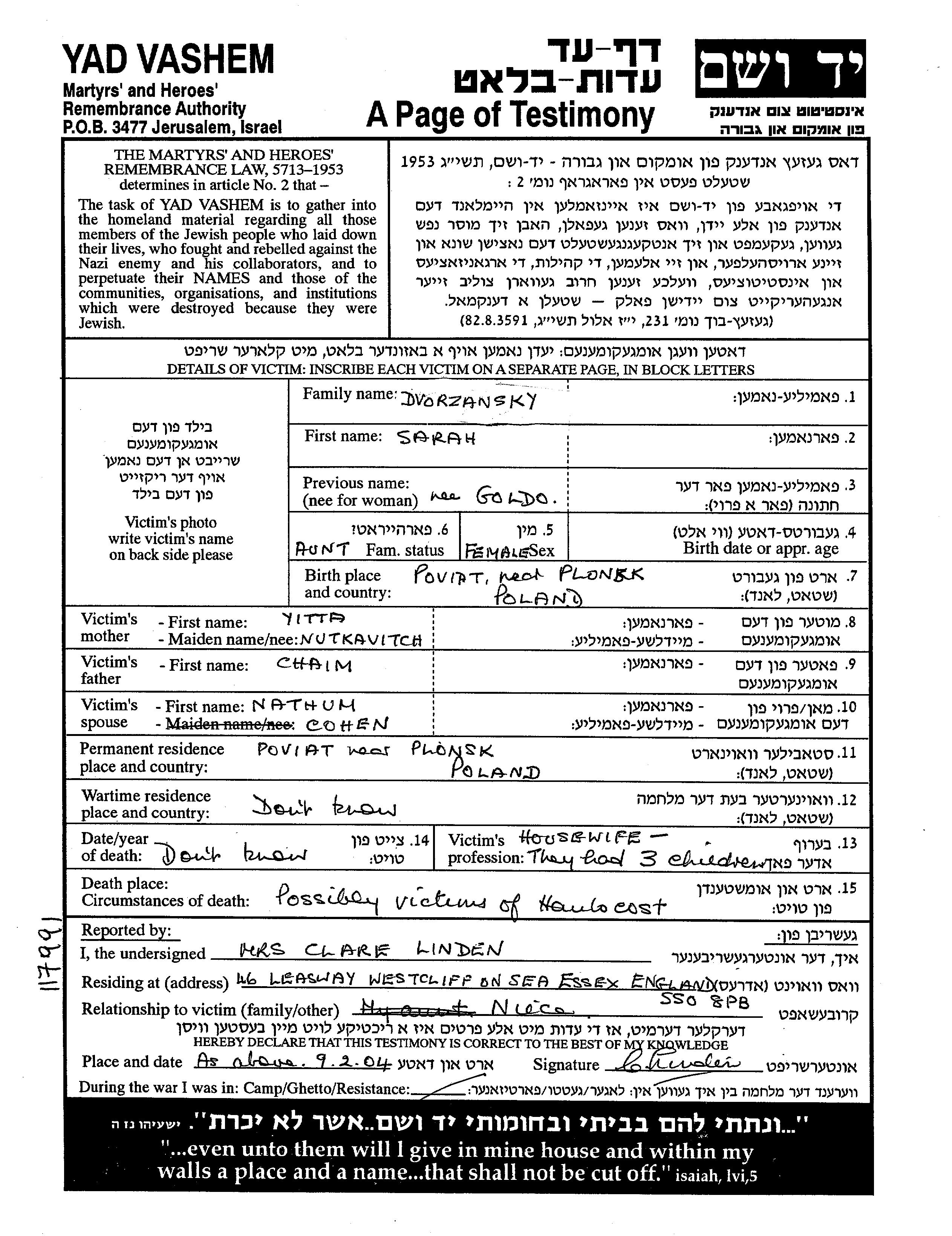 Sarah Dvorzanski Cohen nee Goldo was born in Plonsk, Poland to Chaim and Yitta nee Nutkavitch. She was a housewife. Prior to WWII she lived in Plonsk, Poland. Sarah was murdered in the Shoah.