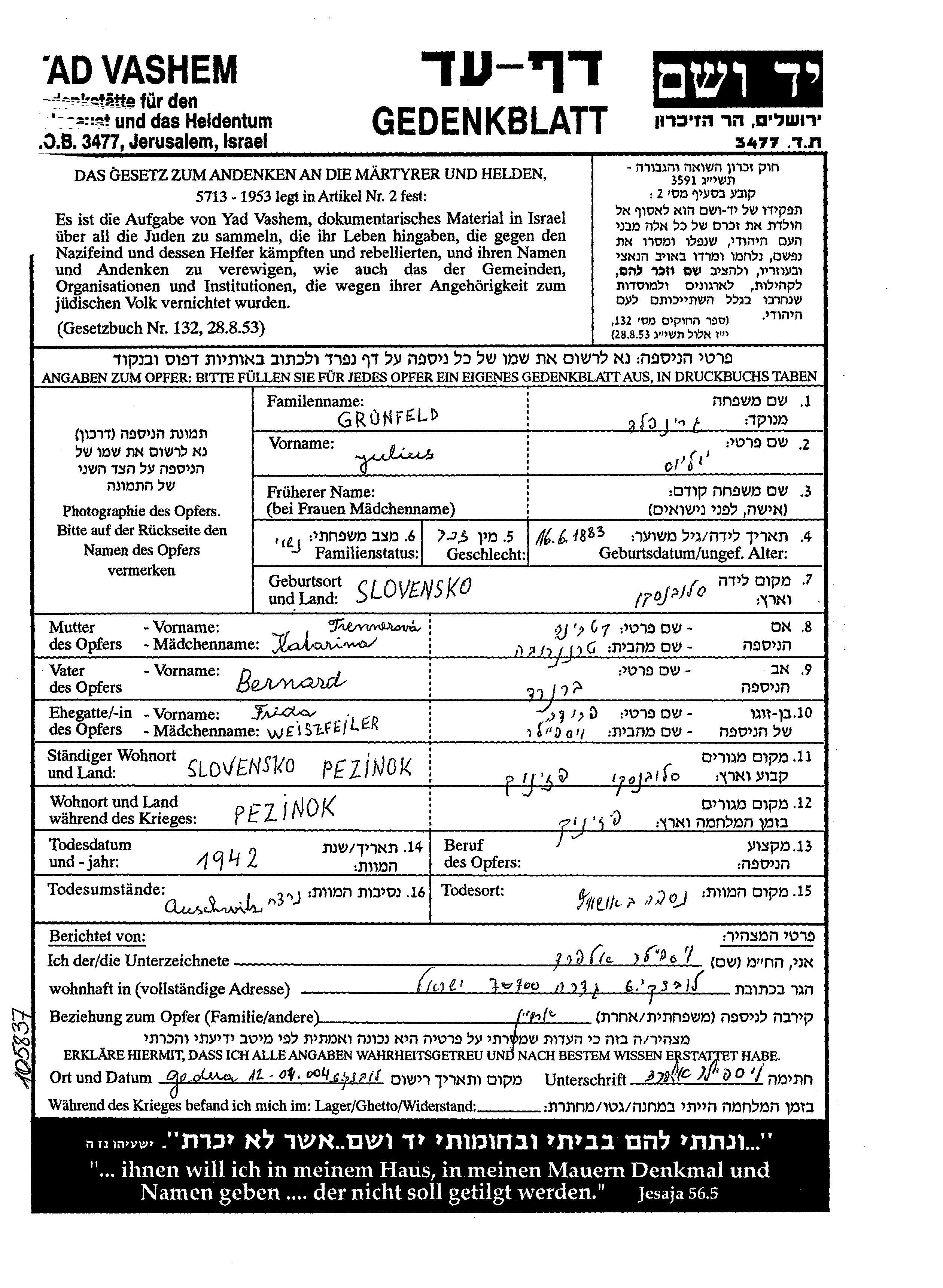 Grinfeld Yulius 1883 Pezinok, Czechoslovakia Page of Testimony
