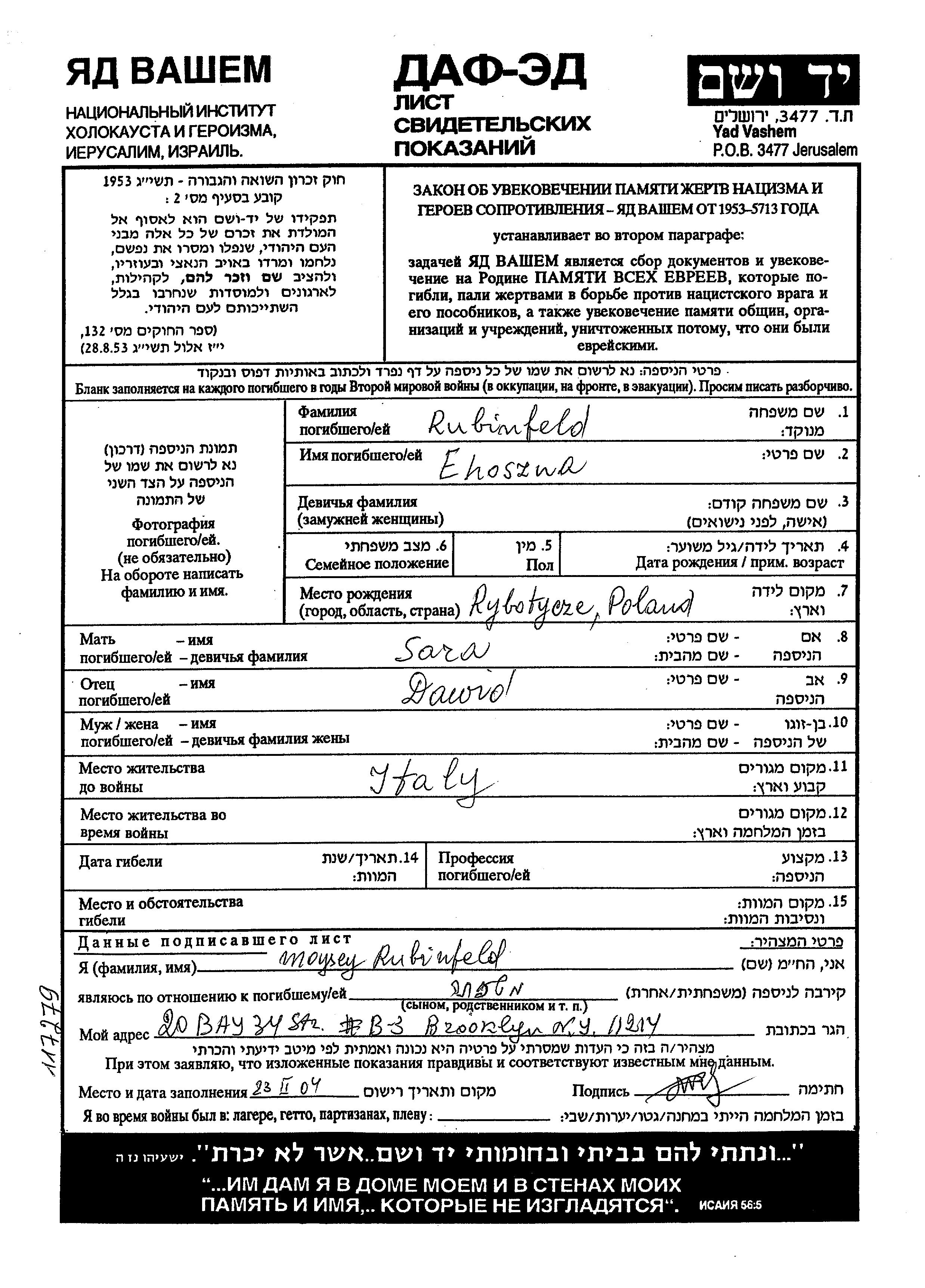 Ehoszua Rubinfeld was born in Rybotycze, Poland to Dawid and Sara. Prior to WWII he lived in Italy.