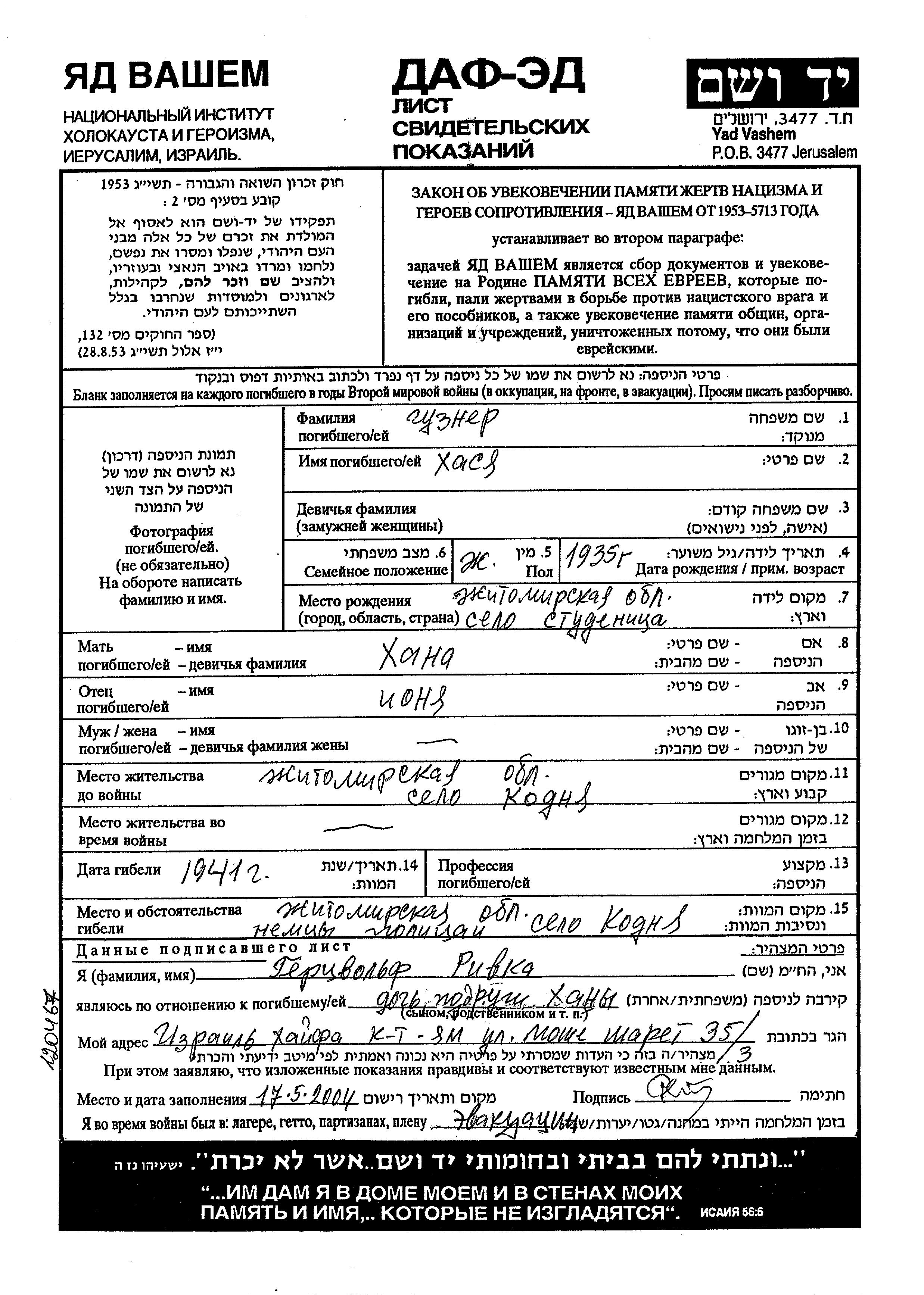 Khasya Guzner was born in Studenitsa, Ukraine (USSR), 1935 to Ionya and Khana. She was child. Prior to WWII she lived in Kodnya, Ukraine (USSR). Khasya was murdered in the Shoah. Place of death: Kodnya, Ukraine (USSR), 1941.