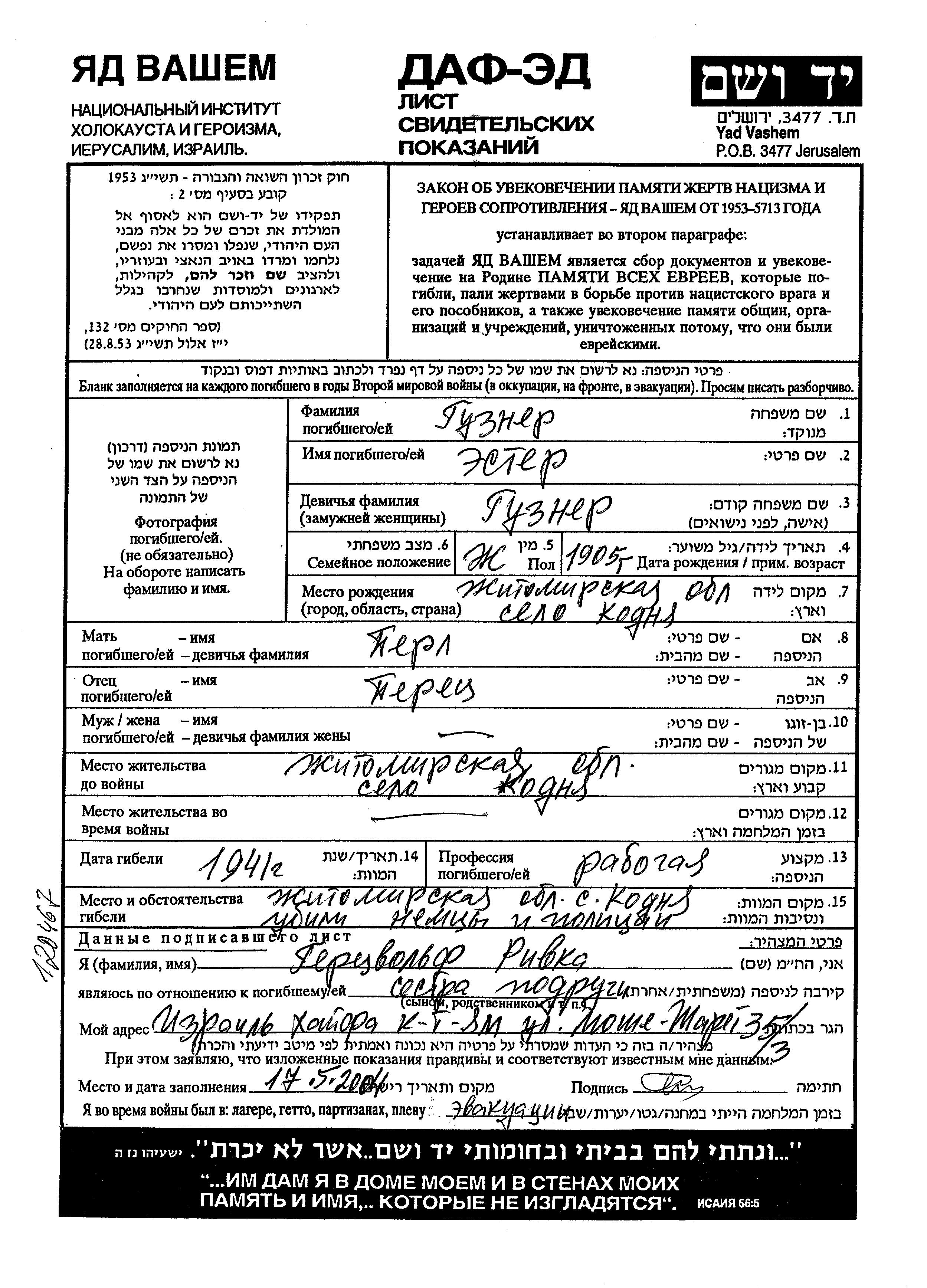 Ester Guzner was born in Kodnya, Ukraine (USSR), 1905 to Peretz and Perl. She was a worker. Prior to WWII she lived in Kodnya, Ukraine (USSR). Ester was murdered in the Shoah. Place of death: Kodnya, Ukraine (USSR), 1941.
