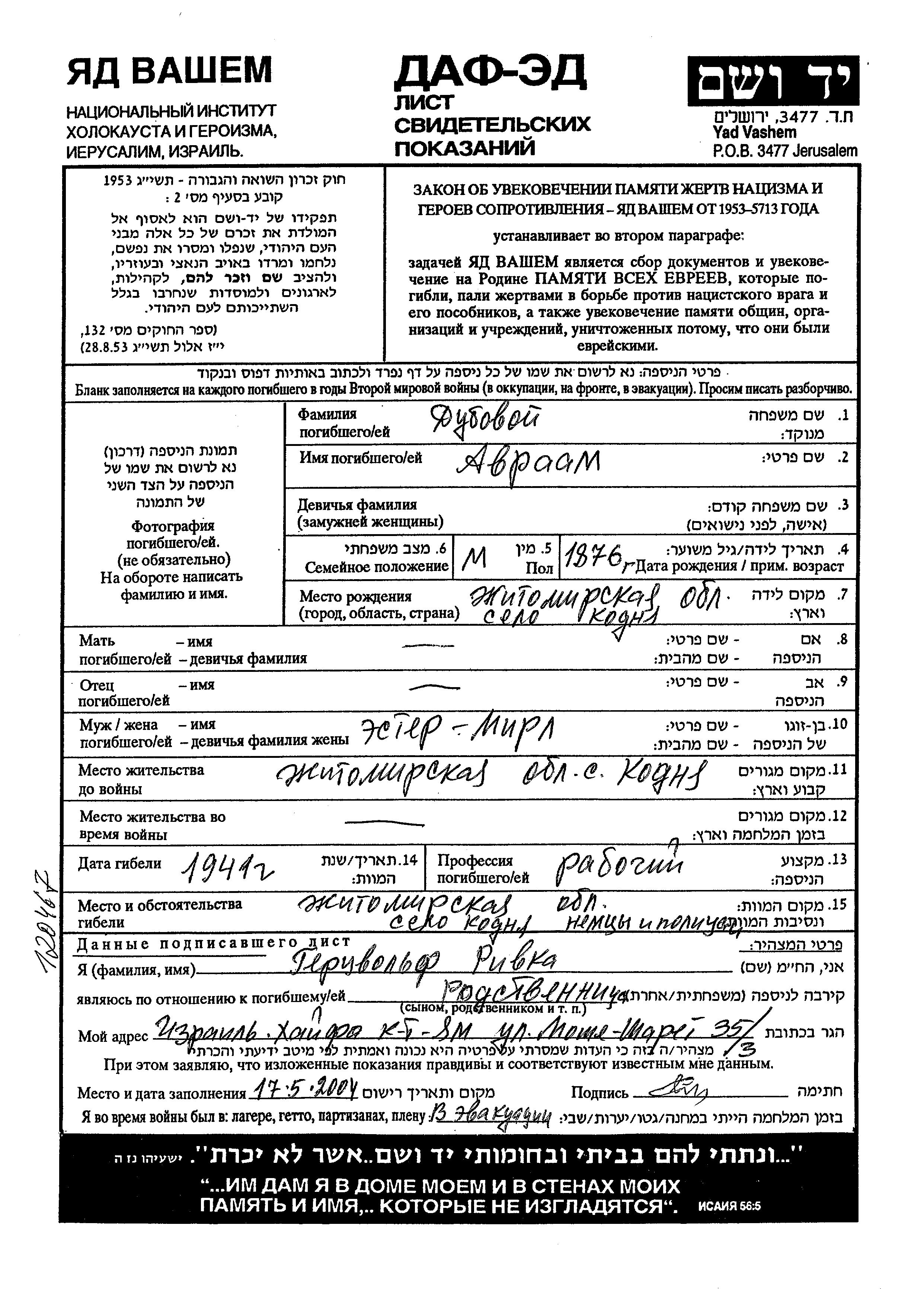 Avraam Dubovoi was born in Kodnya, Ukraine (USSR), 1876. He was a worker. Prior to WWII he lived in Kodnya, Ukraine (USSR). Avraam was murdered in the Shoah. Place of death: Kodnya, Ukraine (USSR), 1941.