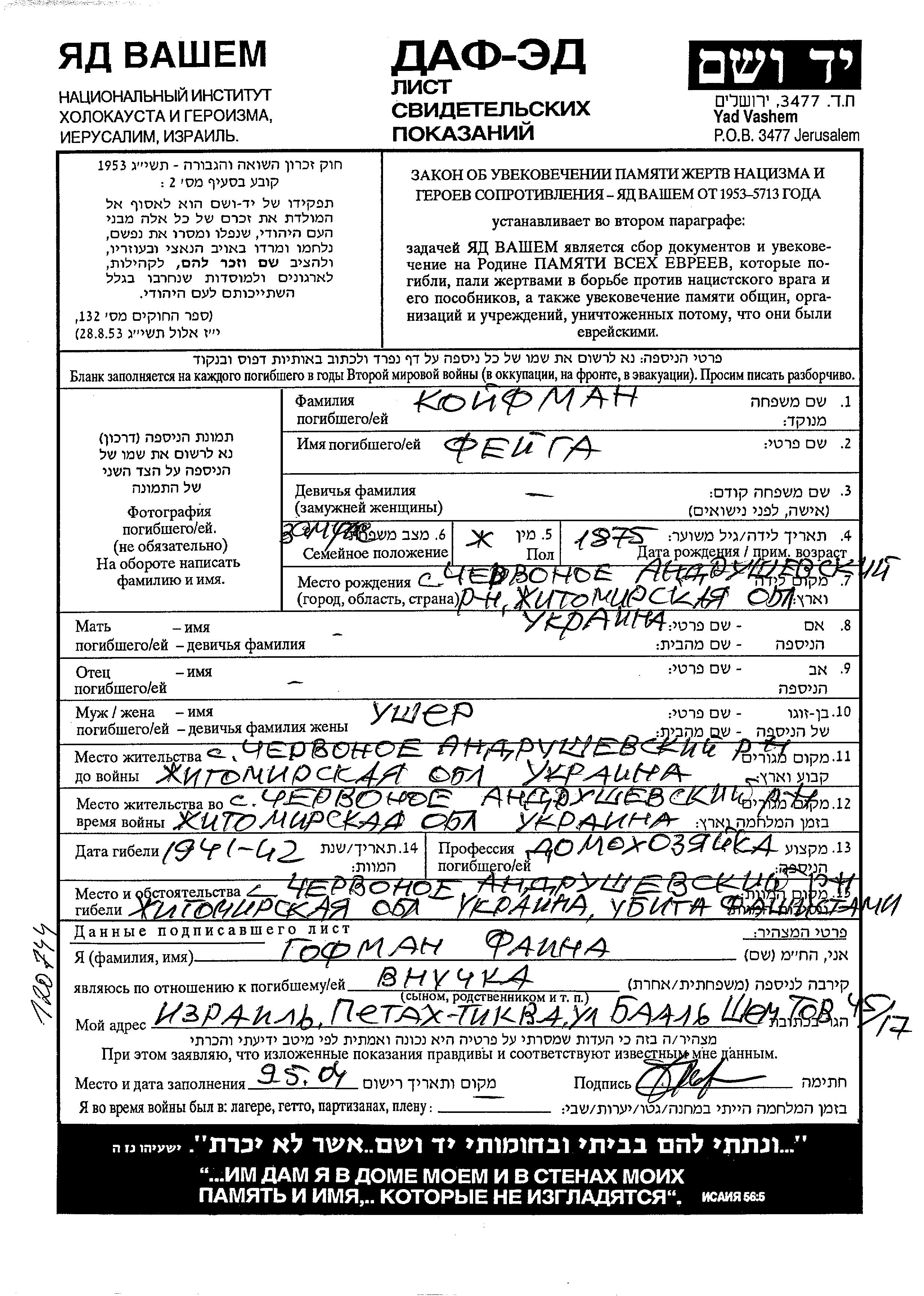 Feiga Koifman was born in Chervonoye, Ukraine (USSR), 1875. She was a housewife and married to Usher. Prior to WWII she lived in Chervonoye, Ukraine (USSR). During the war she was in Chervonoye, Ukraine (USSR). Feiga was murdered in the Shoah. Place of death: Chervonoye, Ukraine (USSR), 1941.