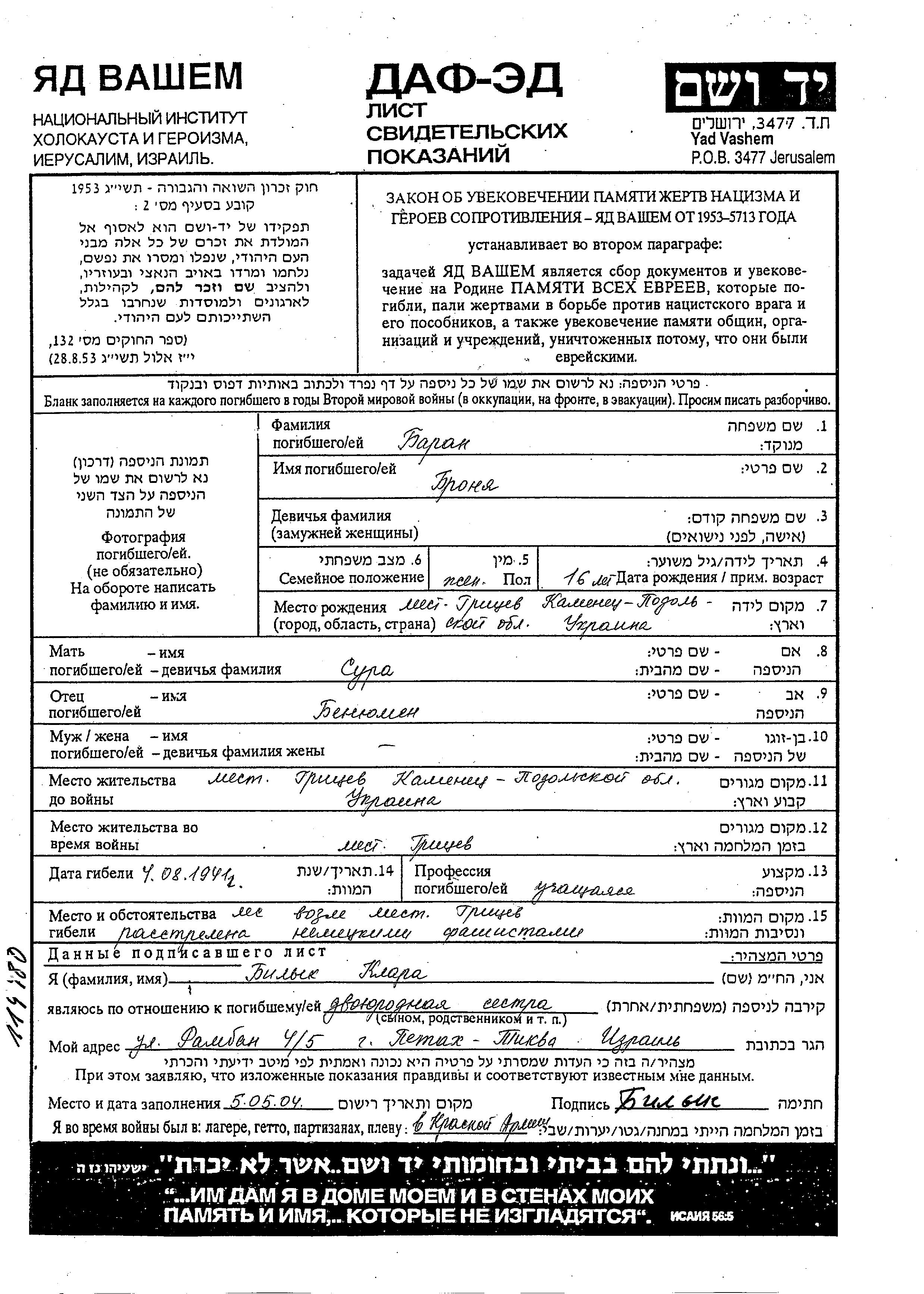 Bronya Baran was born in Gritsev, Ukraine (USSR), 1925 to Benyumen and Sura. She was an uchashchayasya. Prior to WWII she lived in Gritsev, Ukraine (USSR). During the war she was in Gritsev, Ukraine (USSR). Bronya was murdered in the Shoah. Place of death: Gritsev, Ukraine (USSR), 04/08/1941.
