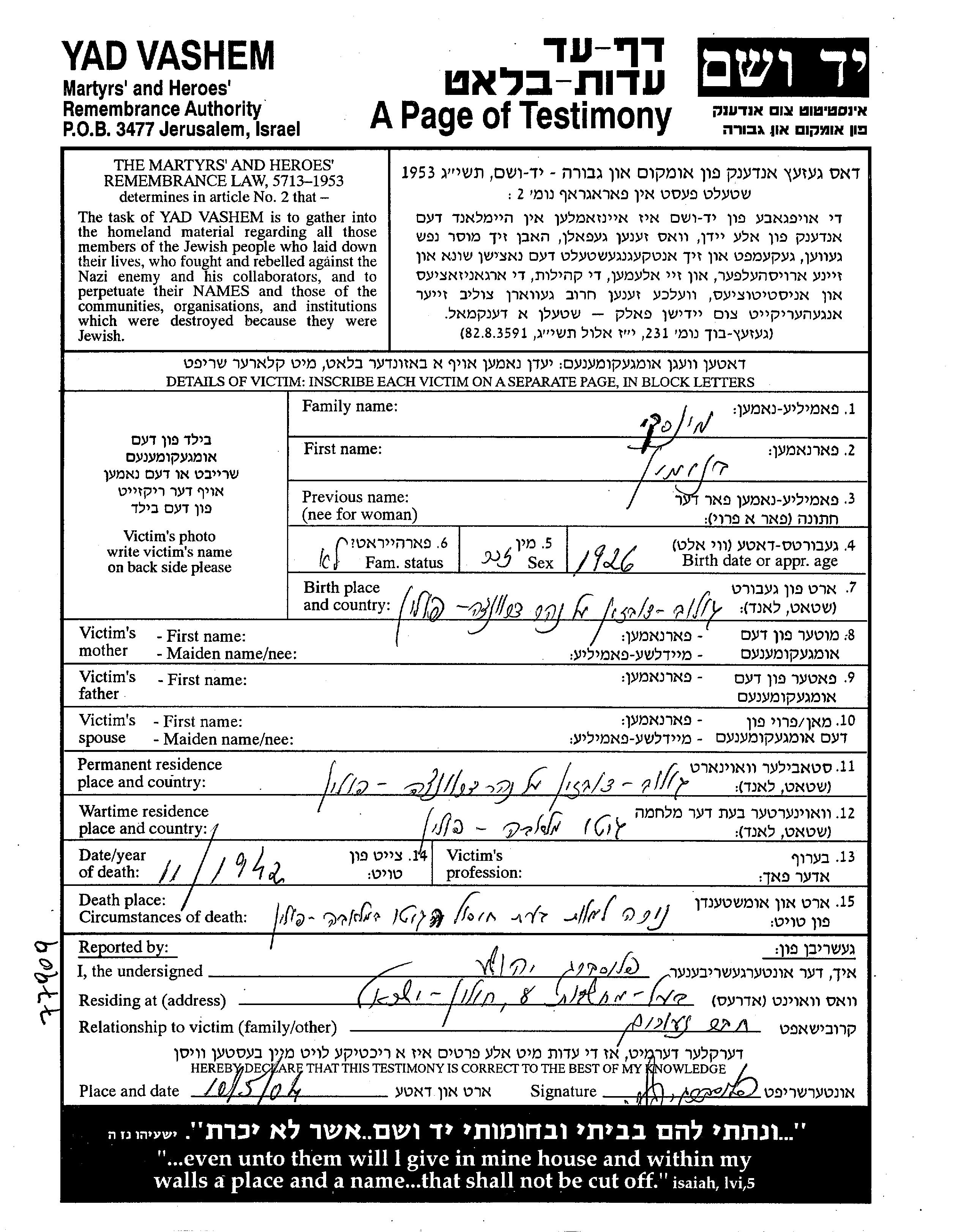 Beniamin Minski was born in Golub Dobrzyn, Poland, 1926. He was teenager. Prior to WWII he lived in Golub Dobrzyn, Poland. During the war he was in Mlawa, Poland. Beniamin was murdered in the Shoah. Place of death: Mlawa, Poland, 00/11/1942.